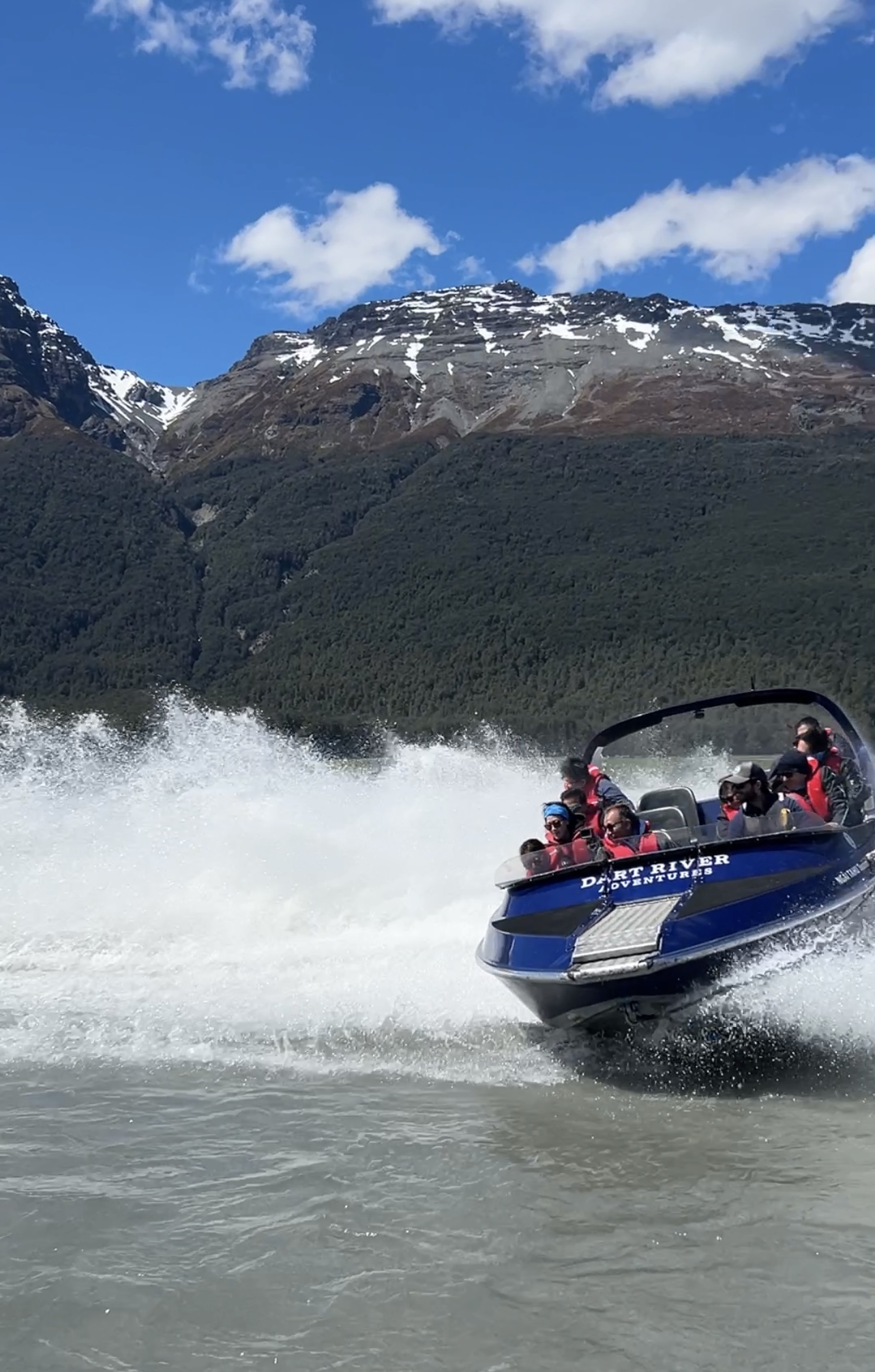 Another highlight was the DART jet ride, an adrenaline-packed adventure that took us speeding across the glacial waters of the Dart River. This high-speed jet boat, capable of holding 12 passengers, cut through the water with incredible precision, zigzagging and spinning in ways that made our hearts race.