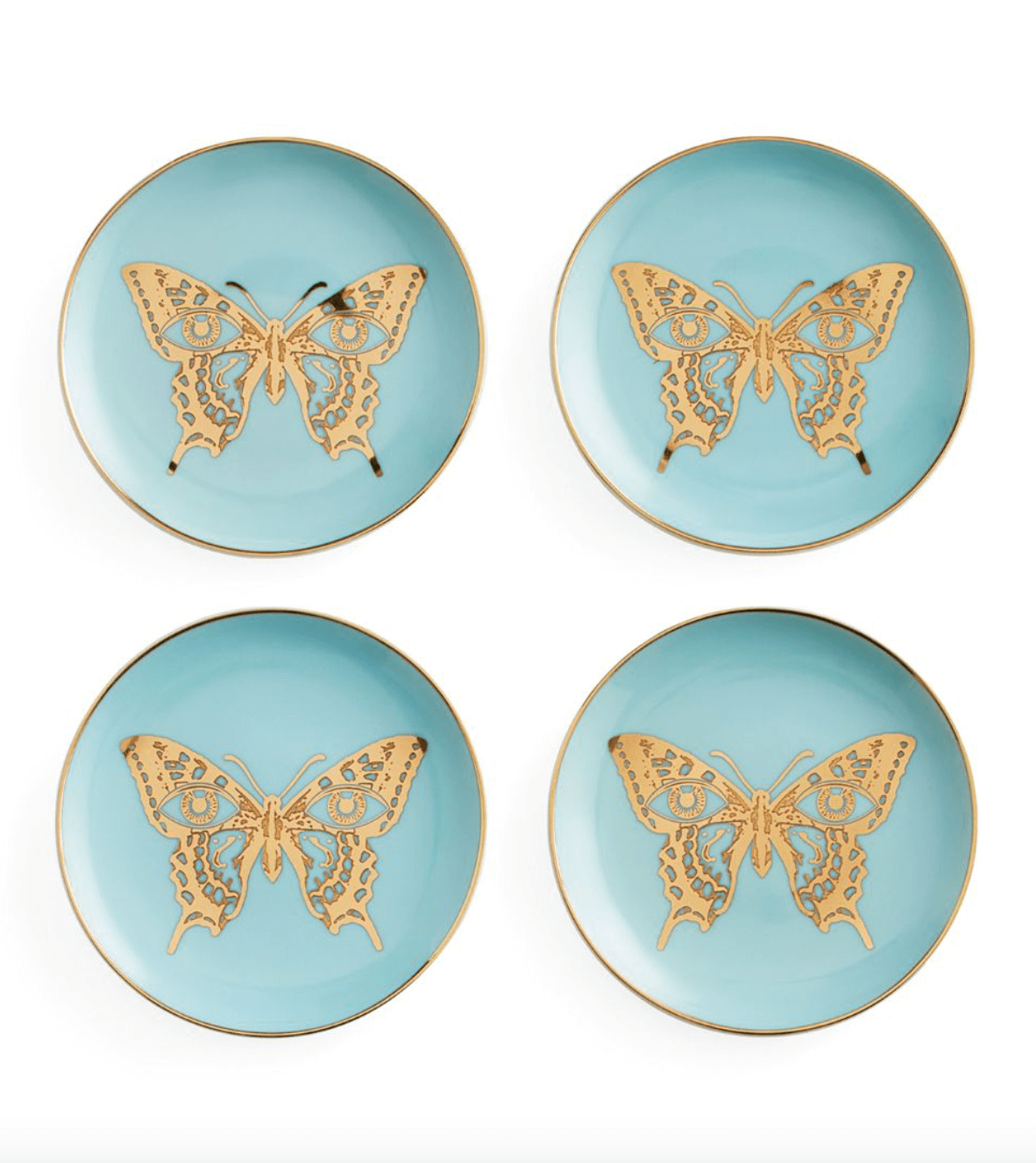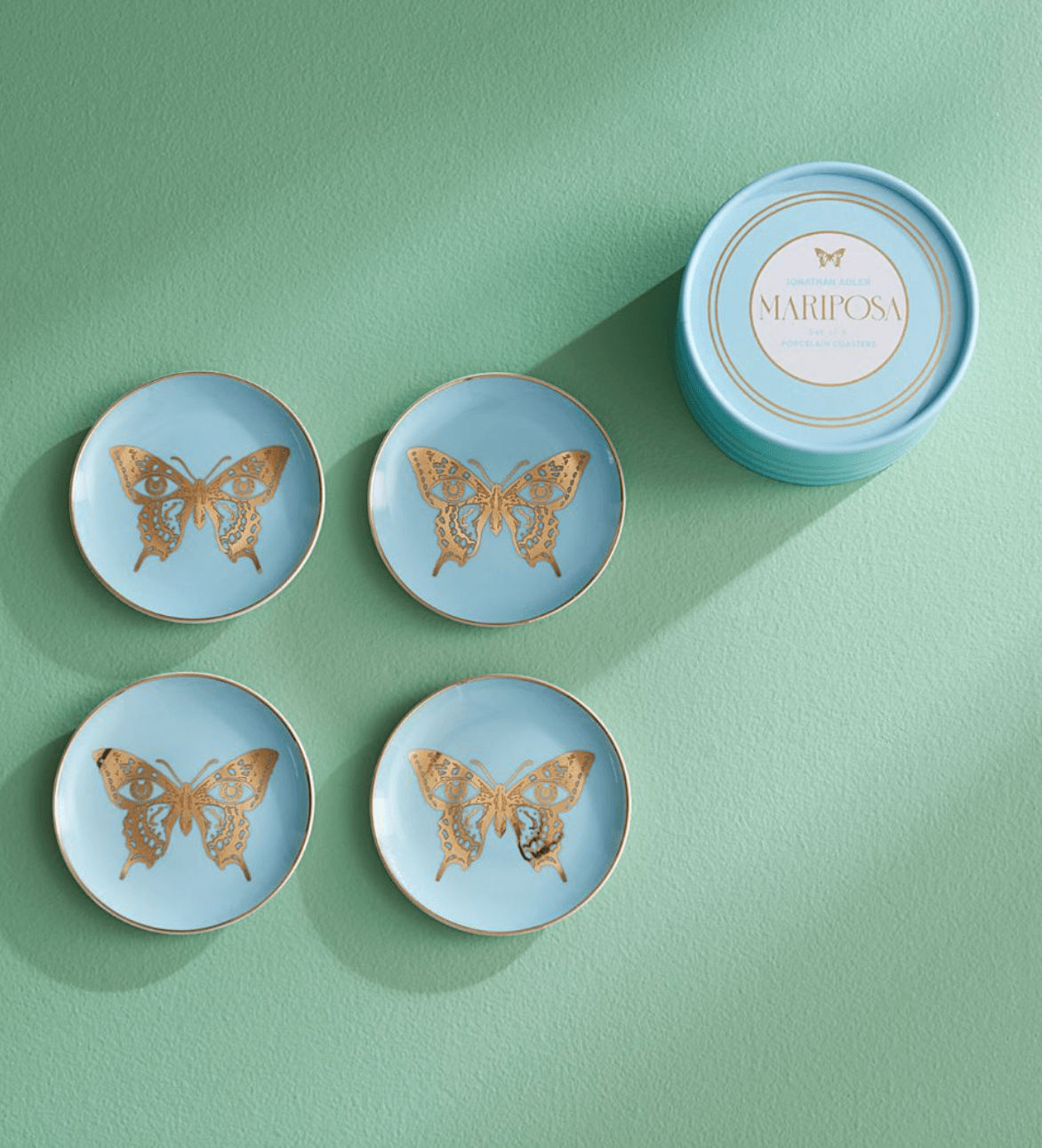 Mariposa” translates to “butterfly” in Spanish. These coasters feature delicate light blue porcelain adorned with shimmering gold details, inspired by the decadence of American fashion designer Roy Halston.