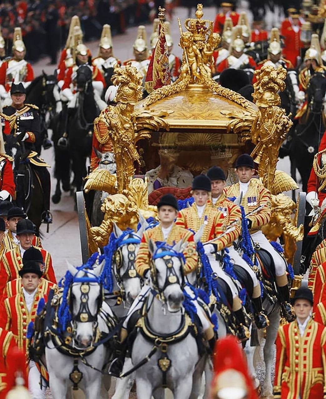 Their Majesties as they travel from Buckingham Palace to Westminster Abbey in the Diamond Jubilee State Coach drawn by six WIndsor Grey horses during “The King’s Procession.”