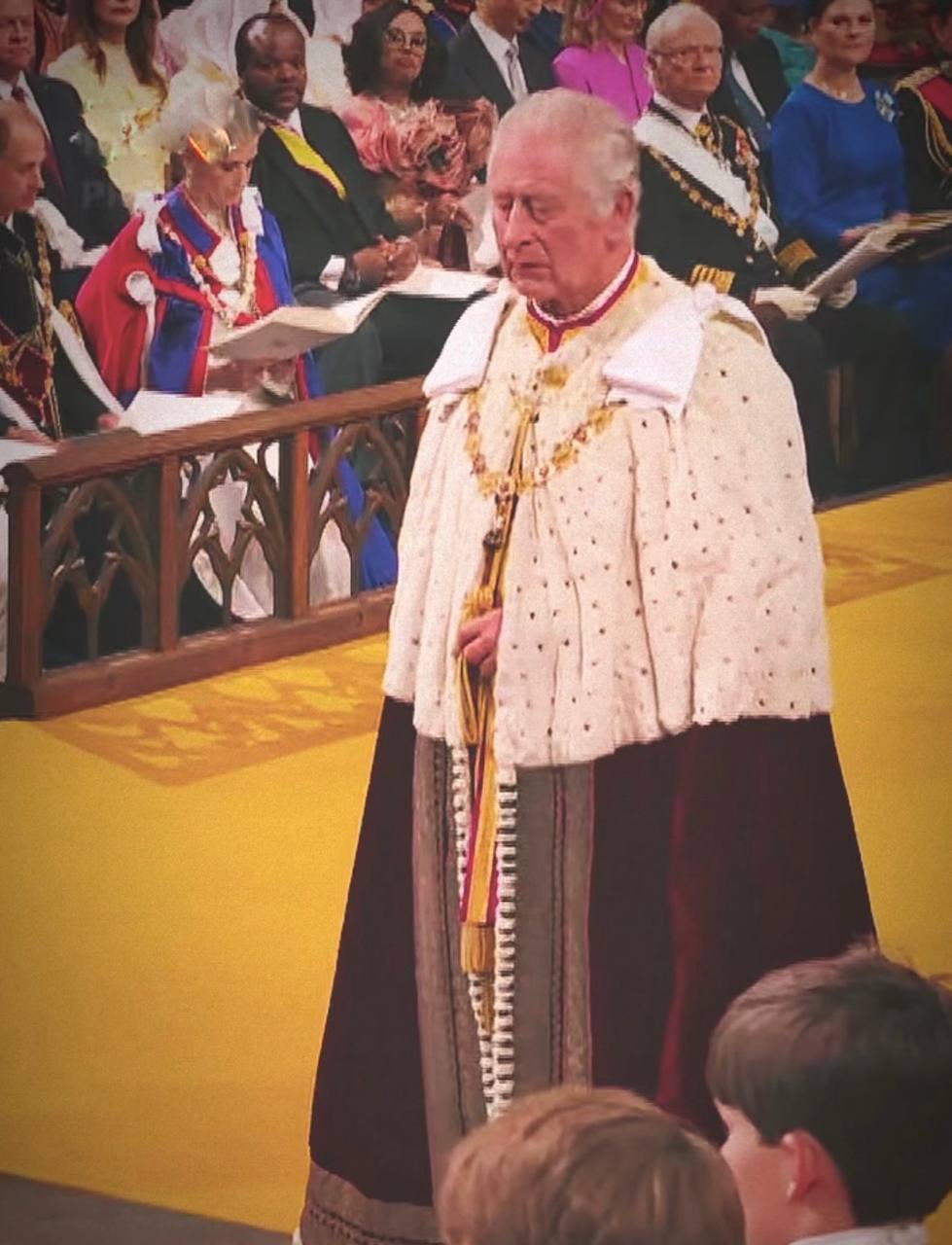 King Charles III is seen turning to all of the four points of the compass prior to the Archbishop of Canterbury’s proclamation of him as the “undoubted King” after which “God save King Charles!” is shouted by the congregation.