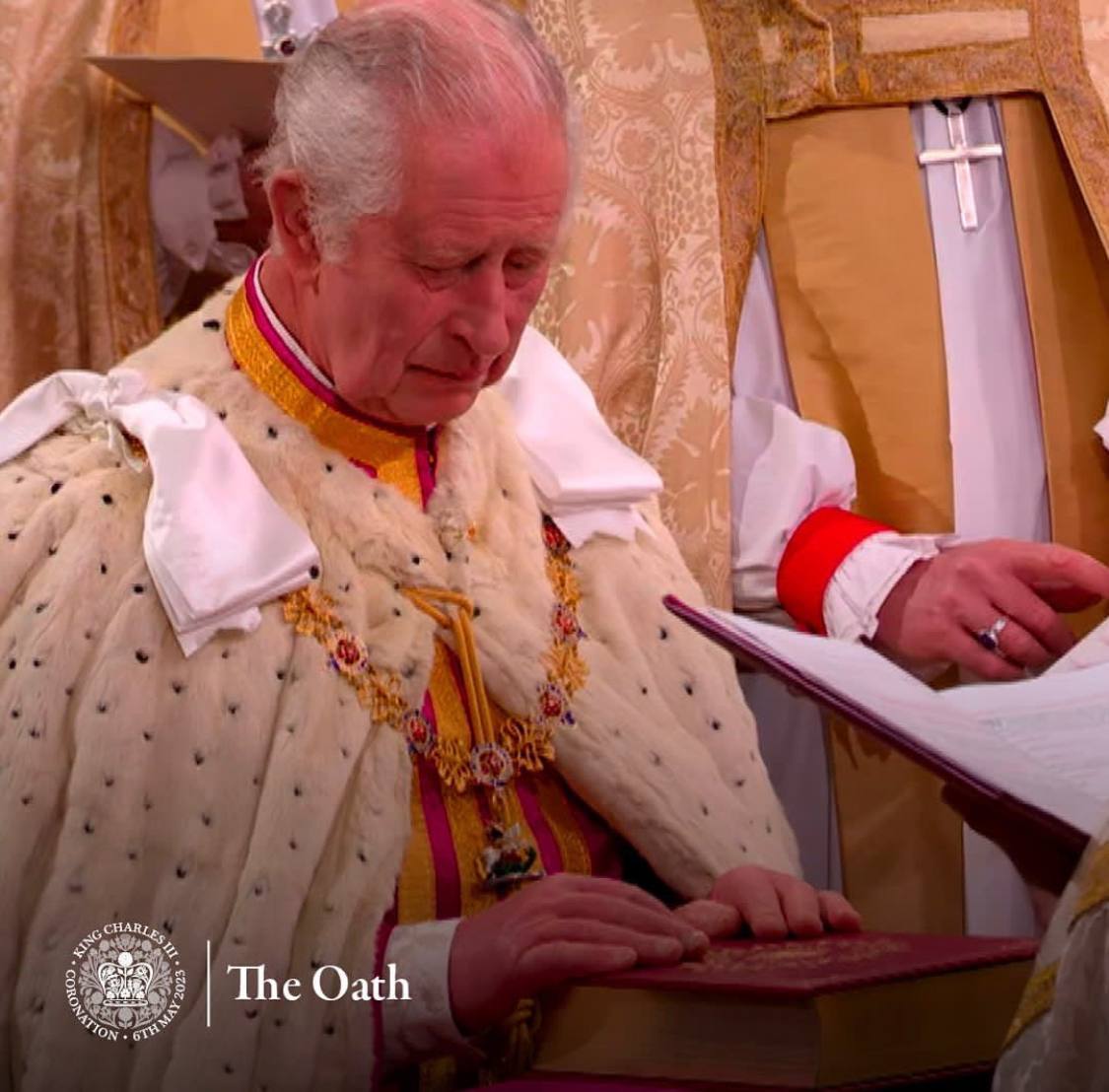 King Charles III places his hands on a Bible and swears to govern the people with justice and mercy, and to uphold the Anglican Church of England and the Presbyterian Church of Scotland. It is the first time that the King had also prayed for grace to be ‘a blessing to all…of every faith and belief’.