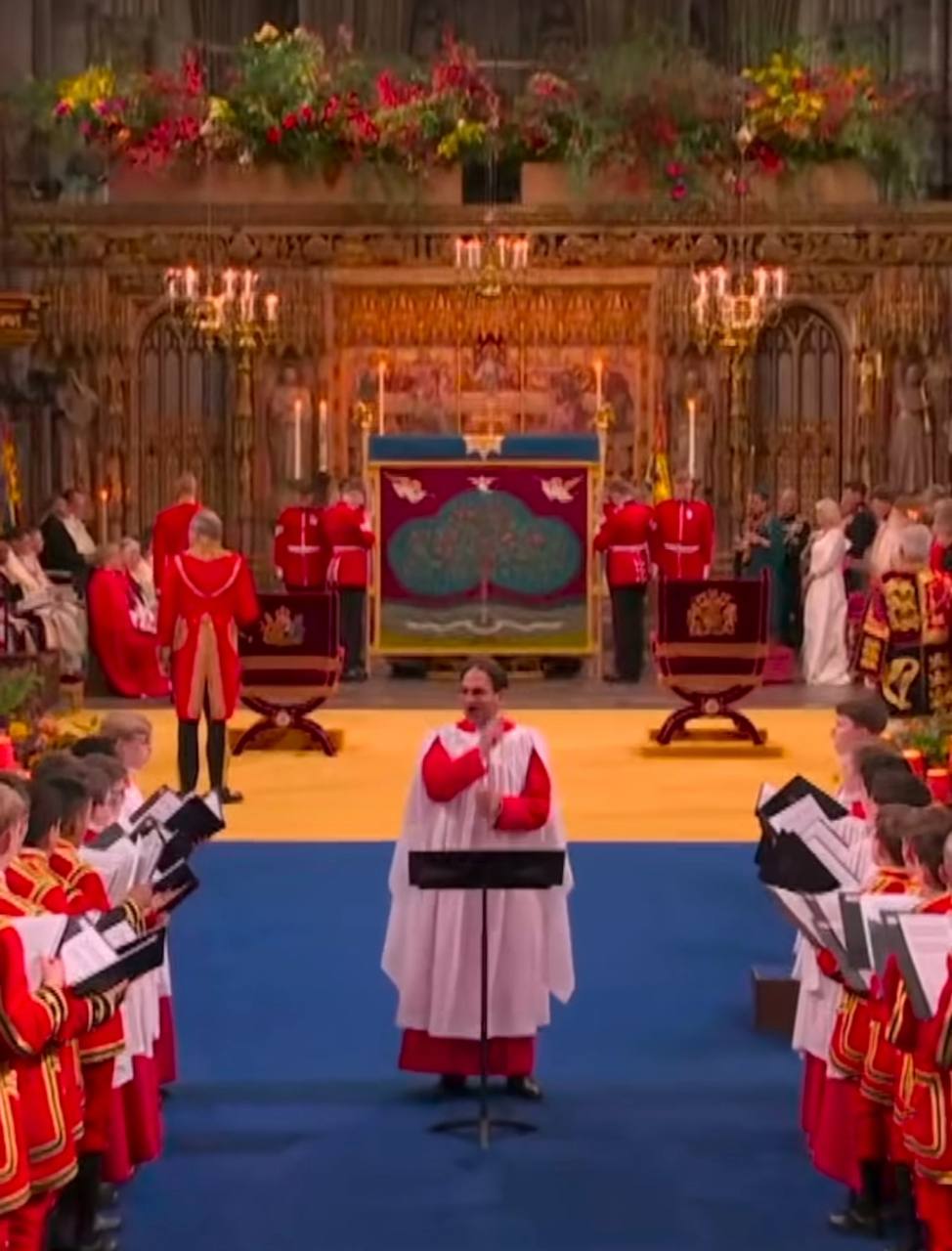 The most sacred part of the Coronation Service, The King is seated in the Coronation Chair while the Archbishop of Canterbury is seen anointing the hands, chest, and head of His Majesty while the choir sings Handel’s “Zadok the Priest,” the coronation anthem. According to the an Instagram post from @theroyalfamily, the oil has been harvested from two groves on the Mount of Olives and was consecrated in a special ceremony in Jerusalem. According to the website, a “coronation spoon” has been used for every coronation since the year 1939 used to anoint The King with a secret mix of oils.