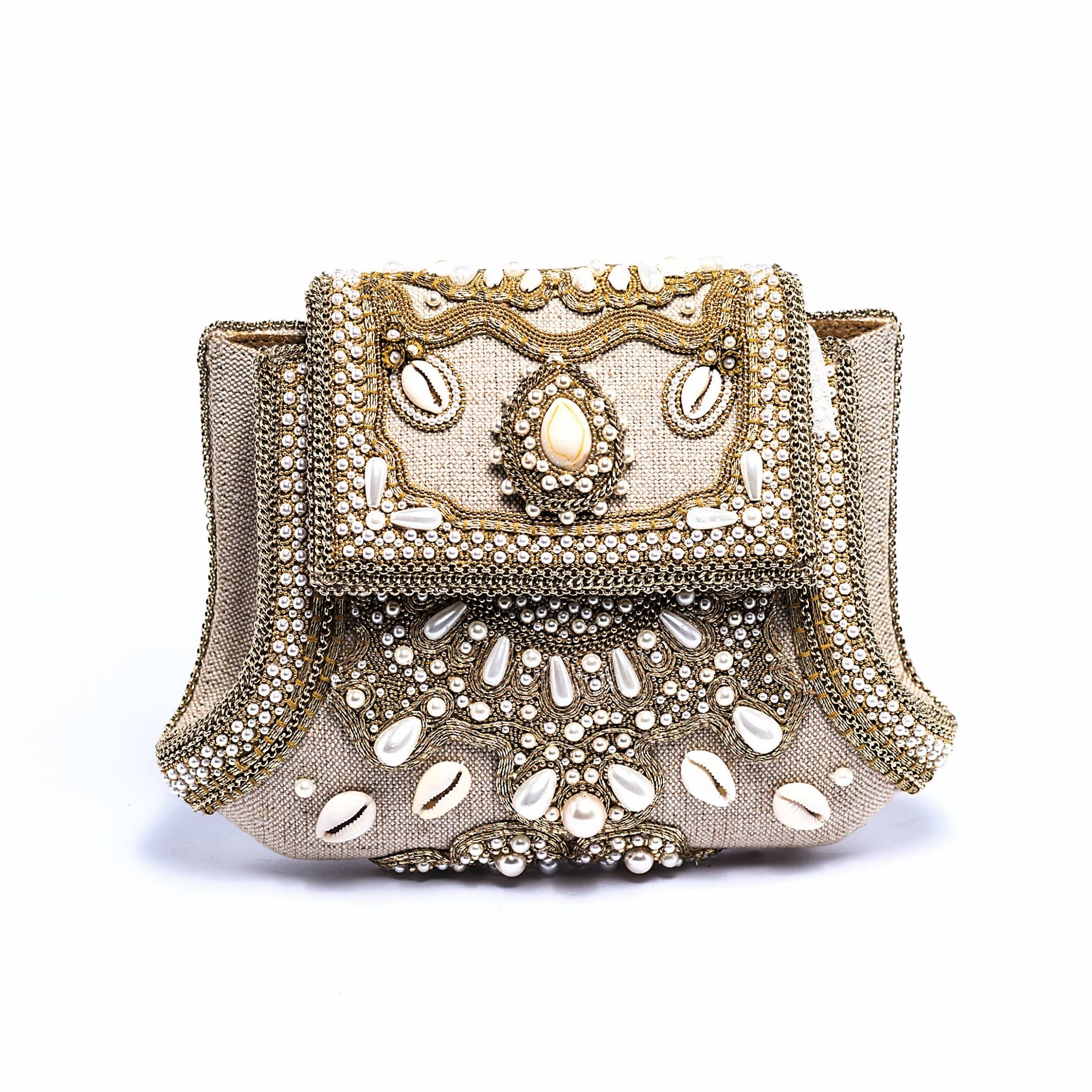 Here we behold one such beaded specimen, the Rama clutch in canvas, embellished with oceanic accents and laced with gold. “Fruits of the sea” as Marga would call it. The piece is akin to the many whimsically ornate creations Valdes Designs is famous for.