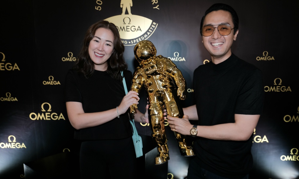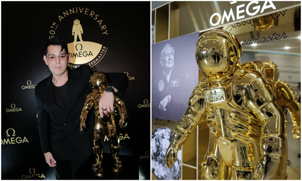 Celebrities took part in commemorating the celebration through taking photos with a mini golden astronaut figure. The black apparel of the guests and the backdrop contrasted well against the gold ‘OMEGA’ logos and the bedazzling sculpture. These render the golden anniversary and iconic history of the luxury brand.