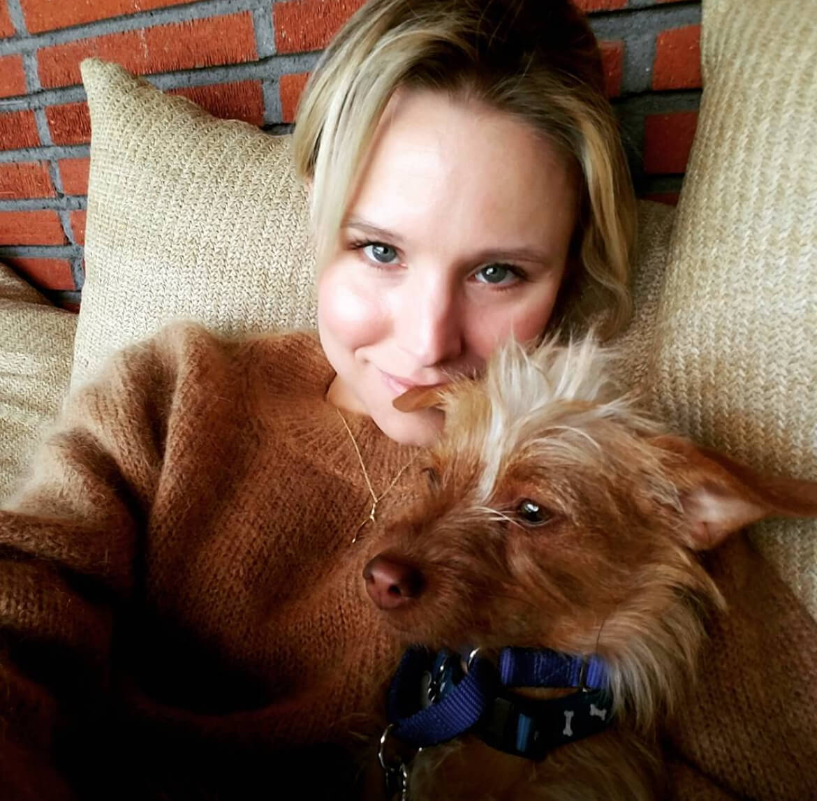 In a selfie posted on Instagram, Bell cuddled up to Muppet, describing her as the “captain of the scaredy cats.”