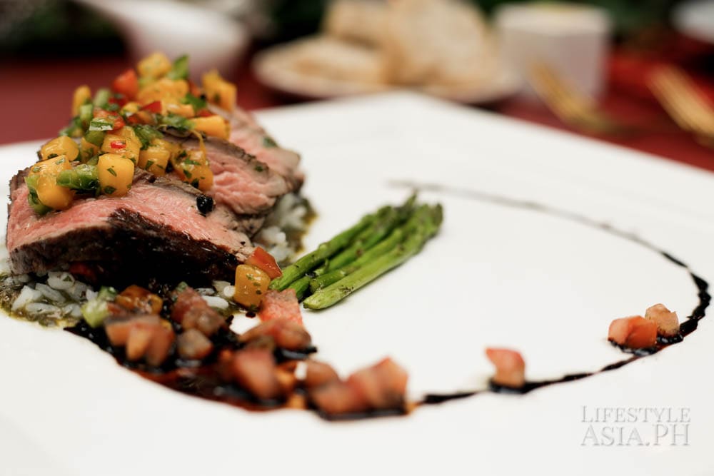 Beef Churrasco with Brazilian Rice, Black Beans Stew, Chimichurri Mango Salsa Glazed with Balsamic Reduction
