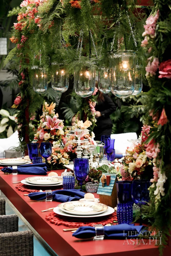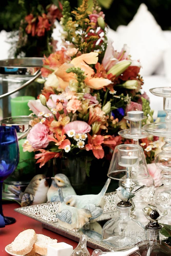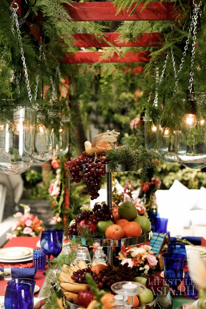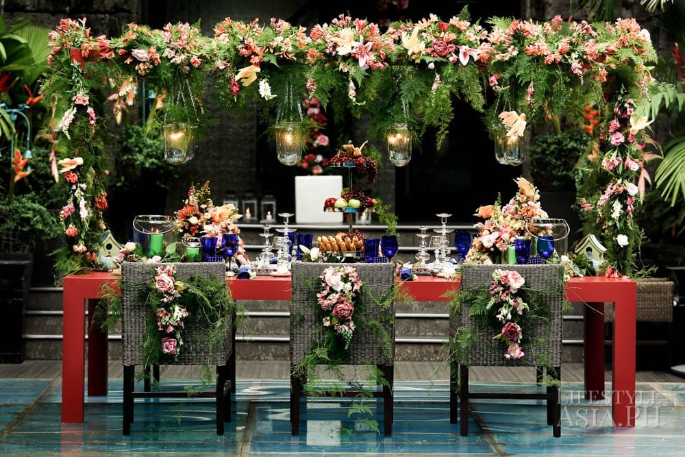 2. Colorful blooms, tropical fruits and decorative elements like birds and hanging candelabras are elements that can help dress up your table.