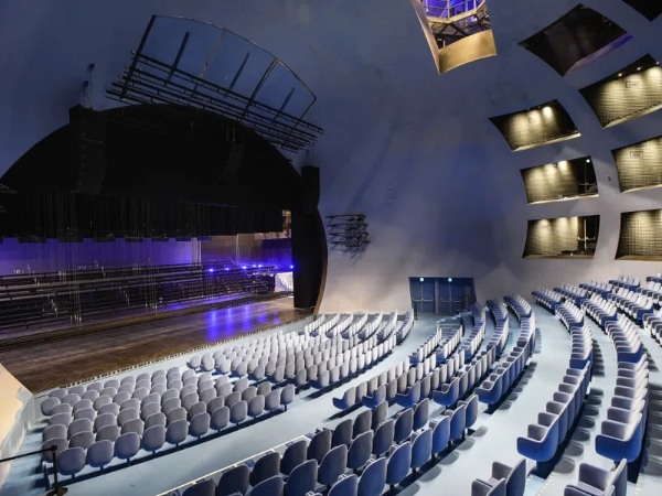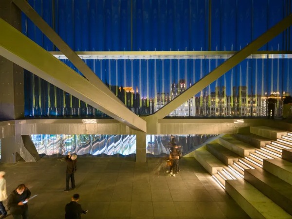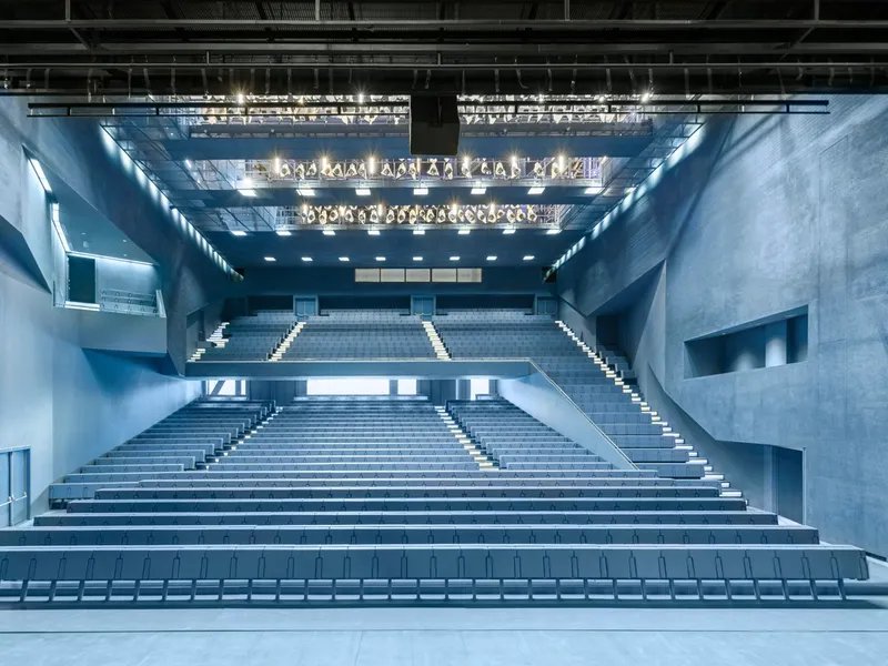 Secondly, the 1,500-seat “Grand Theater” caters to various performance types, while the 800-seat “Blue Box” is for exploratory presentations. The latter can open up to combine with the Grand Theater to create a 2,300-seat space.