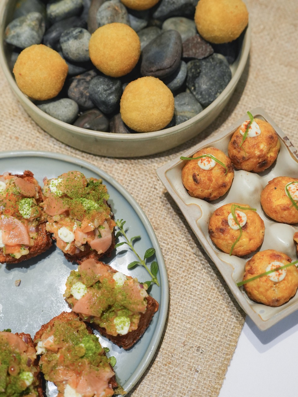 Soulful nibbles; Mushroom & Truffle croquetas, Salmon Tartare on Tapioca cracker, Txistorra Takoyaki; A beautiful salt-encrusted whole salmon carved table side