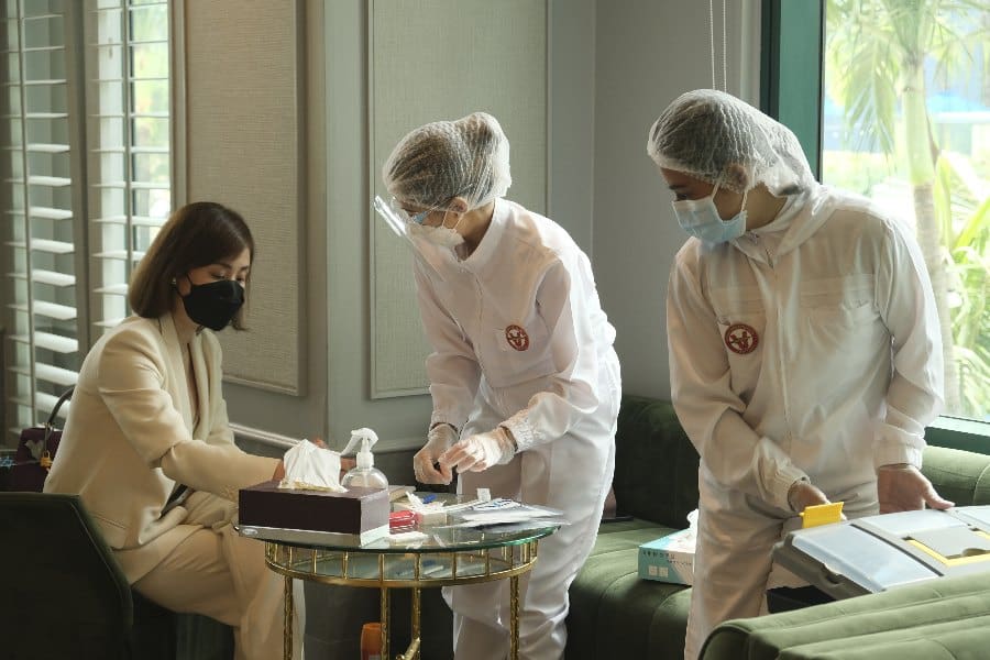 Before admission to the private events space, attendees underwent a swab test by Avignon Clinic as a safety protocol. Upon entering, the decor of fresh white flowers, pillar candles, and a crisp tablescape by event designer Teddy Manuel greeted guests.