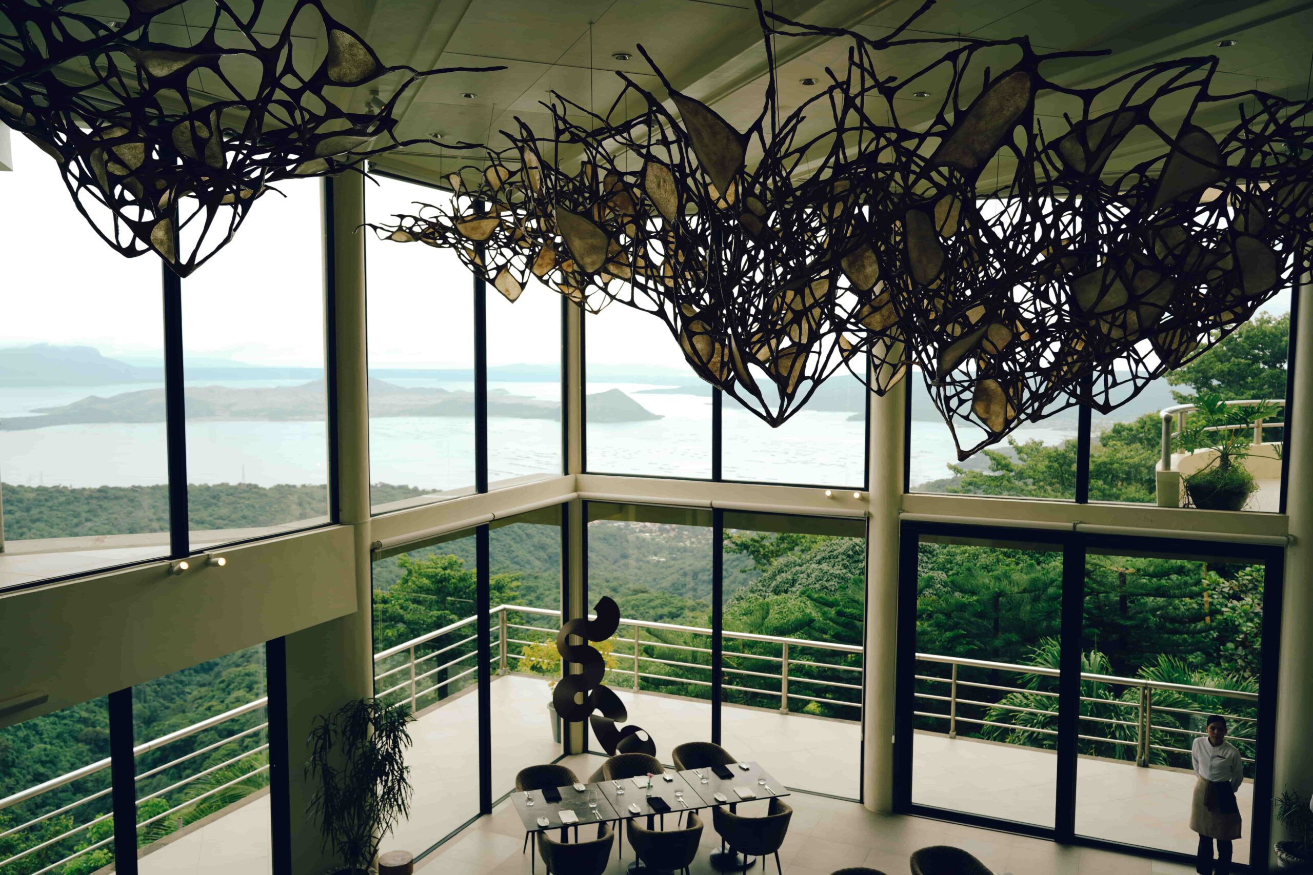 Inside Sinta Restaurant, guests are surrounded by contemporary art and a sweeping view of Taal Lake/Photography by Kim Santos of KLIQ, Inc.