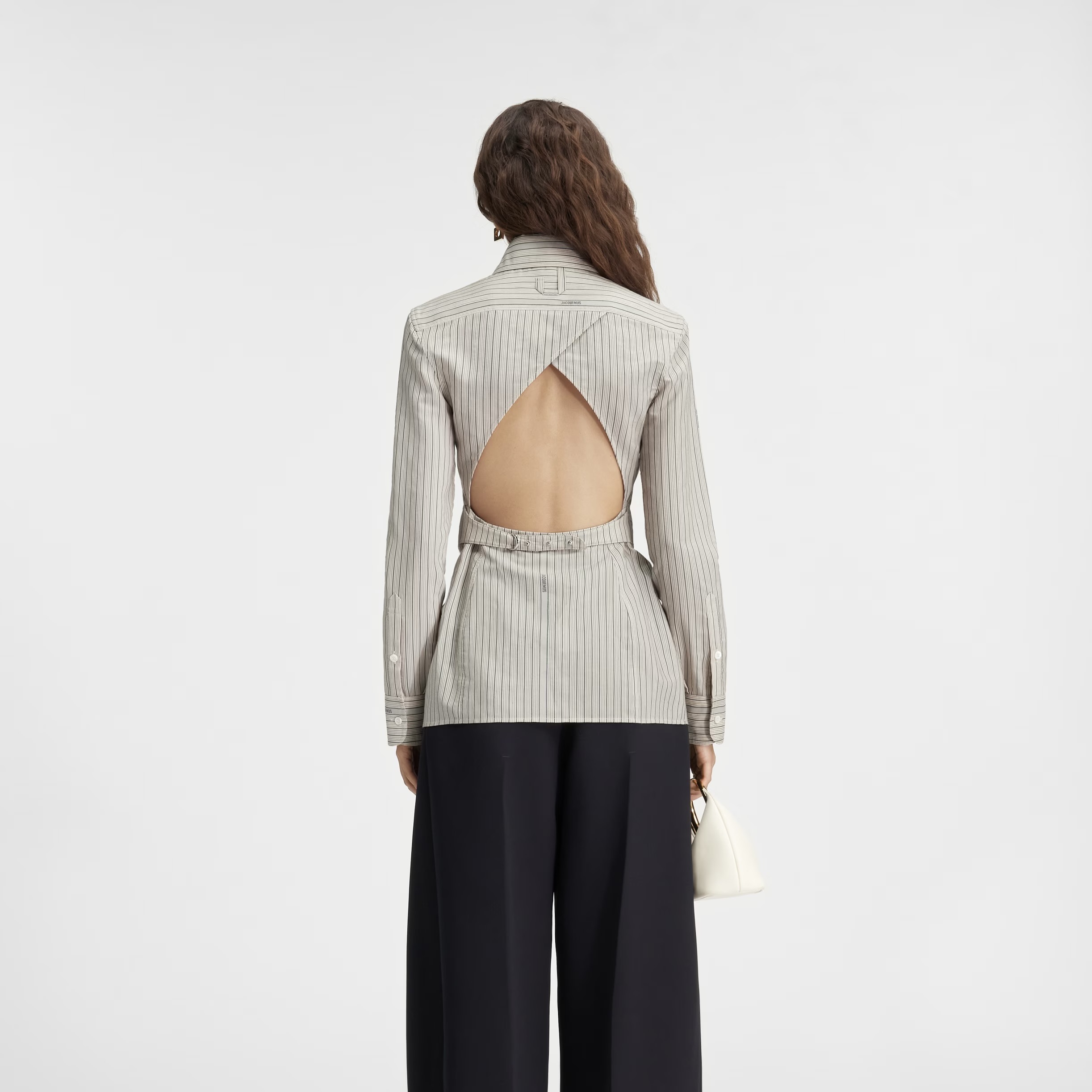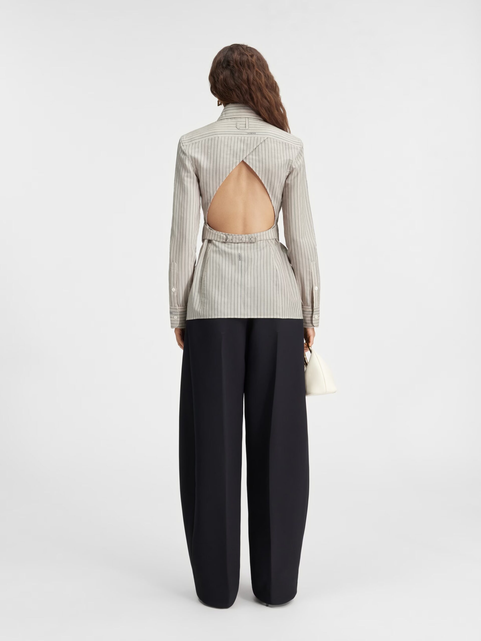 The La chemise de costume button-down shirt from Jacquemus embodies the viral trend. The fitted backless shirt is all business and fun at the same time. Moreover, the button-down piece can also be used for layering with a blazer—it is the perfect transition day-to-night top.