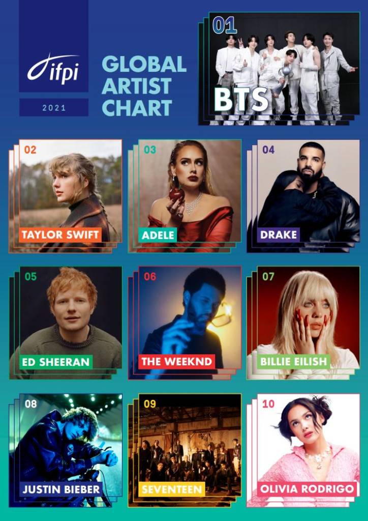 BTS was joined in this year’s chart by their K-pop colleague Seventeen, who made their first appearance at #9. The IFPI attributed this achievement to the “growing popularity of K-pop with music fans across the globe.”
