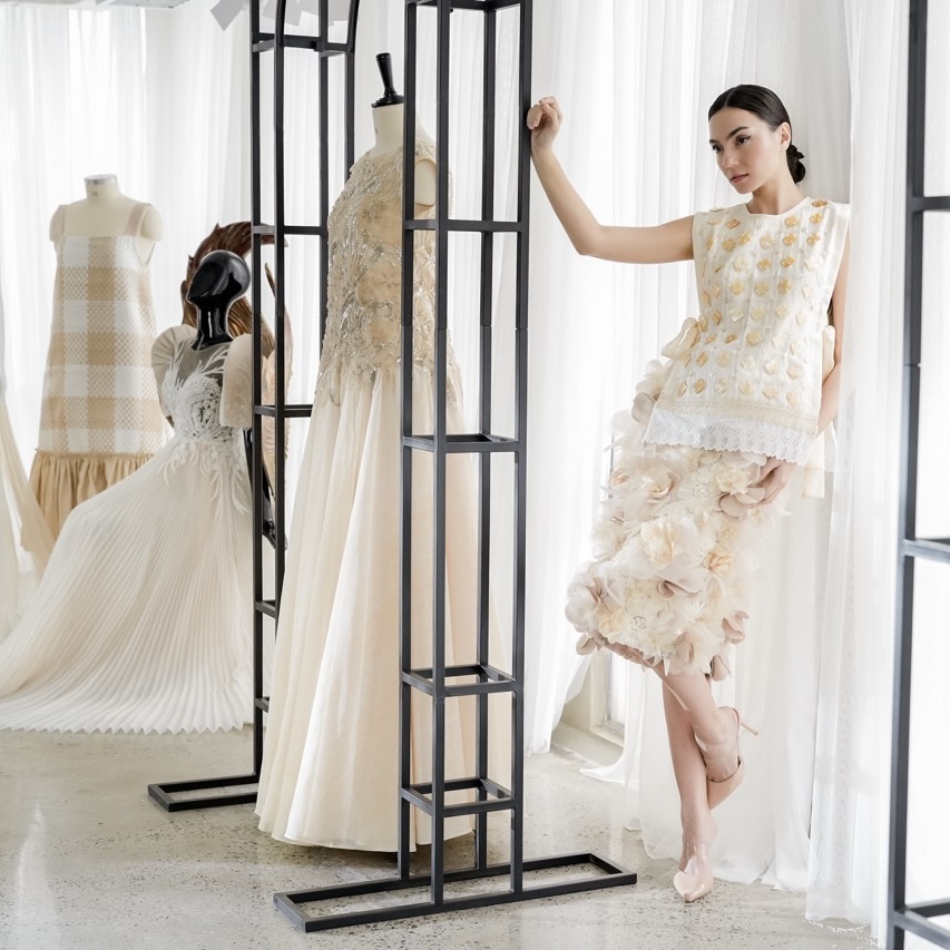 A bespoke fitting area serves as a key highlight of the atelier. Here, patrons can immerse in the rituals of dressing. It is also an intimate corner where their “dream designs come to life.” One side of the space functions as a display corner. Pieces on display pay homage to the rich textures, patterns, and intricate details borne from the Philippines’ rich culture of craft.
