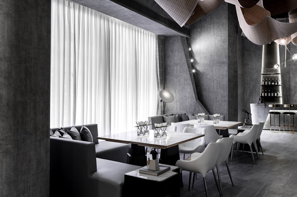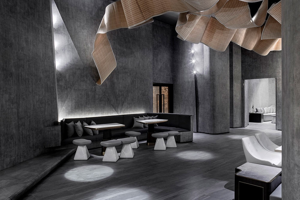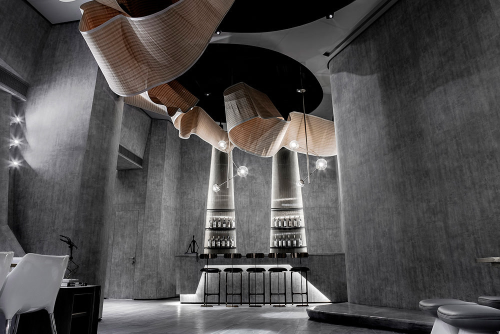 Located in the business district of Dongguang City, The Flow of Ecstatic is a bar that boasts an all-grey interior highlighted by a swooping ceiling sculpture made of bamboo. Designed by Daosheng Design, this minimalist establishment features a bar counter made of stainless steel, walls covered in grey silk, and sleek grey tiles on the floor. The intention of the design, according to lead designer Yongming He, is to encourage patrons to decompress from their hectic urban lifestyles. This is an inviting place where people can slow down, have a drink, and relax. Different forms of leisure activities can be enjoyed in the different seating areas: cocktails can be sampled at the bar while appetizing dishes can be savored at the tables. There are also groupings of stools and low tables for casual drinks with friends.