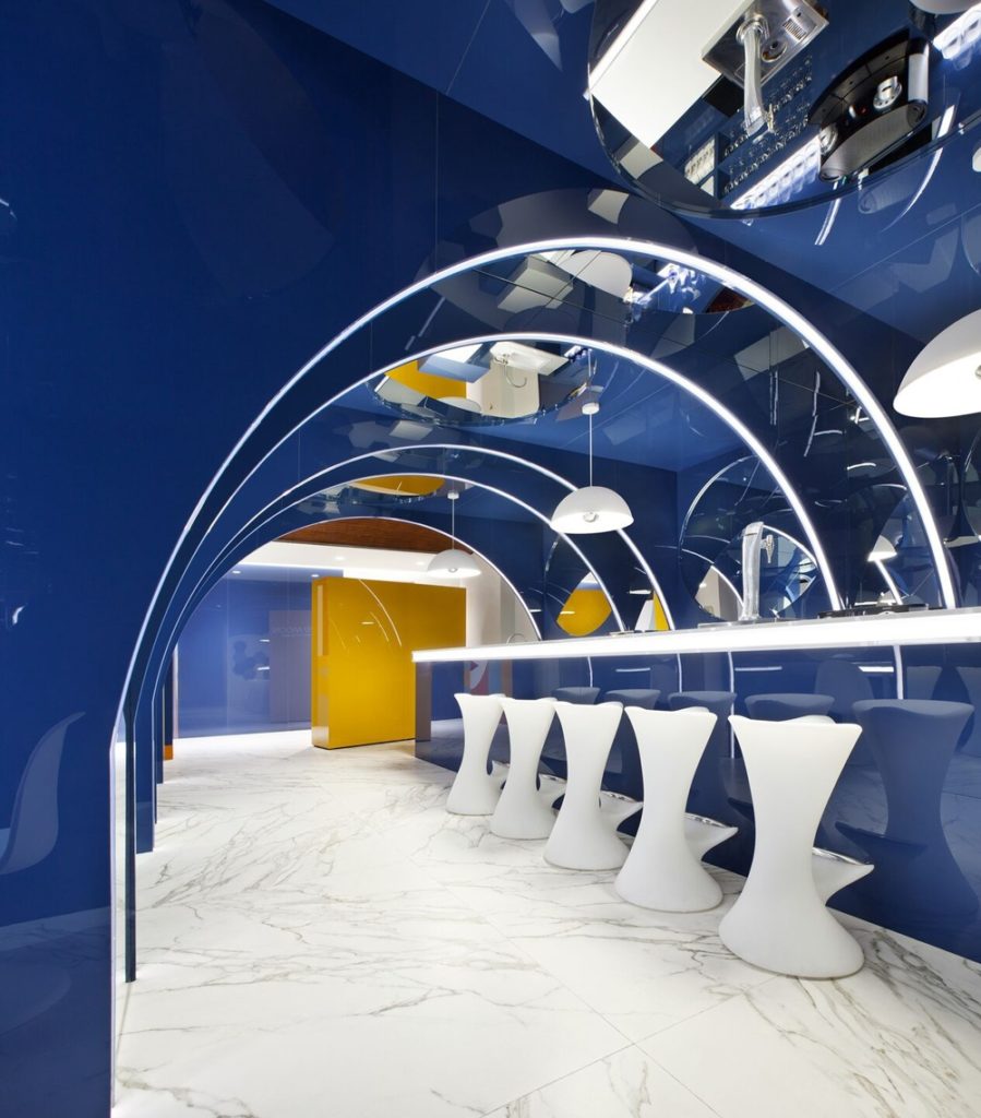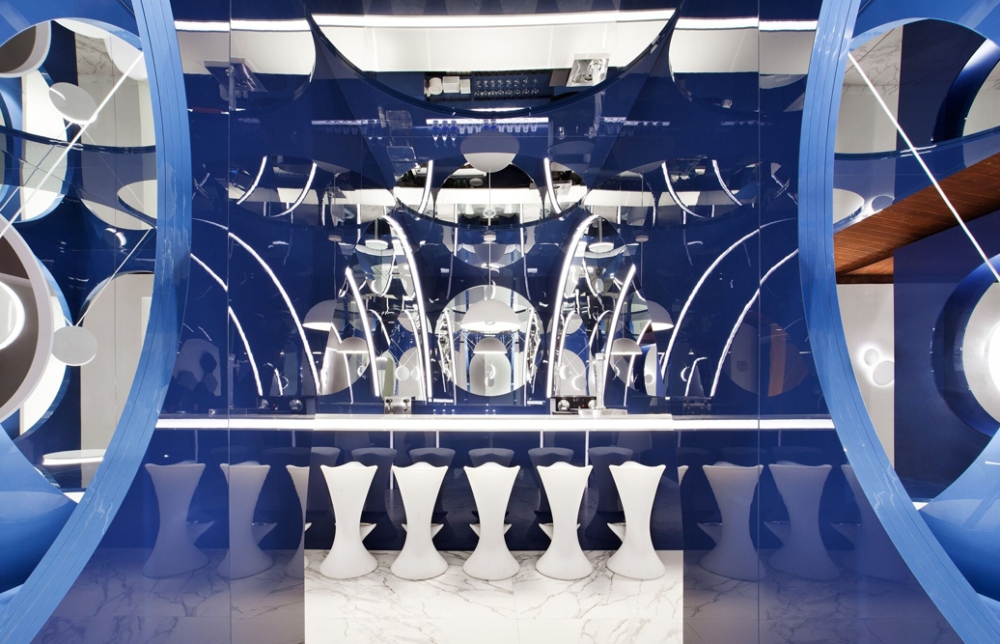 Upon entering this amazing bar created for the Casa Décor 2020 event, patrons are immediately immersed in a world of vibrant color and dazzling reflections. Designed by Ruiz Velásquez Studios, Blue Moon’s sculptural interior features repeating circles and arches that give the entire space the look of an optical illusion. Ultra-glossy surfaces reflect light and shapes throughout the mostly indigo blue lounge while an earthy vaulted brick ceiling provides contrast and a touch of warmth to the ultra-modern design and materials. Patrons can enjoy privacy in one of the sleek, cozy cubicles or mingle with other guests at the bar.