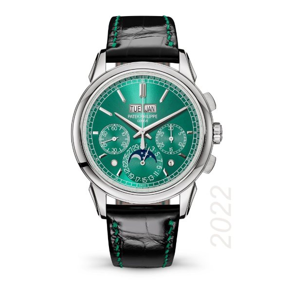 Specifically made for the charitable event, it features an emerald green shade with matching stitching on its alligator skin strap. The case back, which uses sapphire crystal, has “Children Action 2022” engraved.
