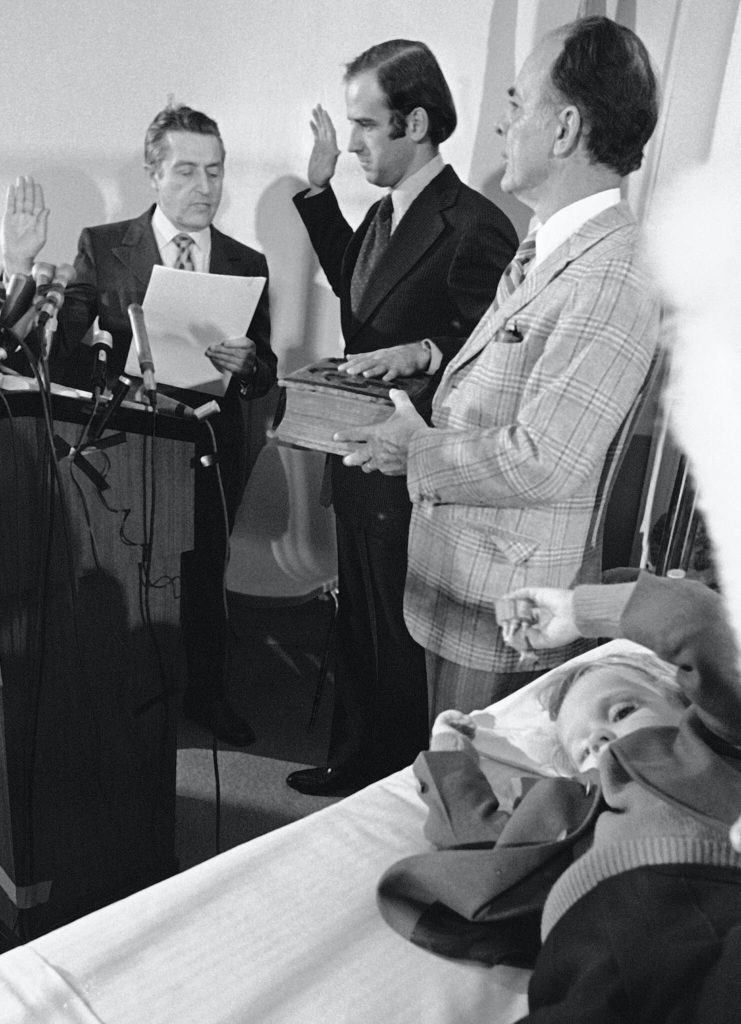 A younger Joe Biden swearing as senator back in 1973 on the same bible. A much younger Beau seen on the bottom right. (Associated Press)