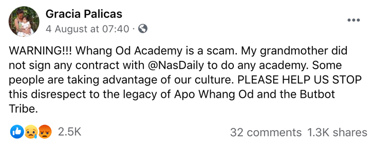Following the backlash, Whang-Od Academy was taken down from the Nas Academy website.