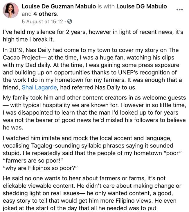 Amid all the backlash, Cacao Project founder Louise De Guzman Mabulo also aired her grievances against Yassin, recounting his 2019 visit to her hometown where he covered her social enterprise. The project aims to support the livelihood of farmers through cacao seedlings as a long-term crop that they can rotate with other short-term crops.