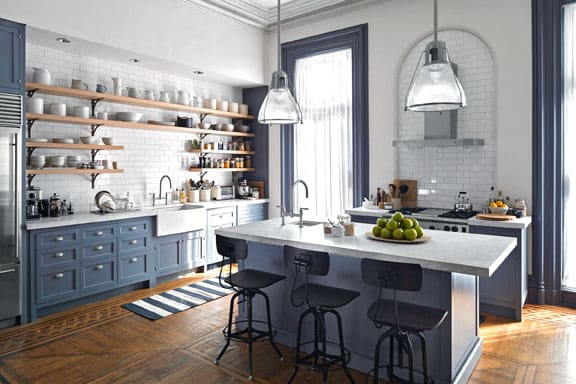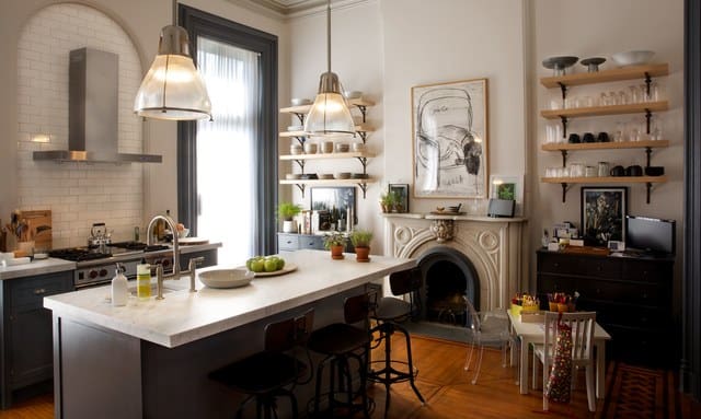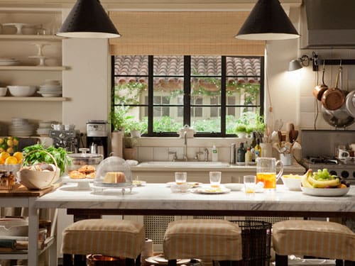 Anne Hathaway’s modern kitchen within her New York City brownstone sits on top of the list of the most beautiful Nancy Meyers movie kitchens. Playing the neurotic though lovable Jules, Hathaway’s character is a hip, young business owner with a flair for fashion. It was no surprise for us to see her well-appointed kitchen perfectly fitting her personality. White brick walls, open storage space, hanging lamps and a stainless steel design element reflects Jules’s no nonsense attitude, although shows her close attention to the rustic and beautiful. We also speculate that Jules had most likely refurbished and renovated this space. The quaint fire place in the kitchen was considered fashionable back in New York’s early days. If we’re creating the back story ourselves, we can see the young Jules, fresh from making her first million dollars, buying an old home in a hip New York village and calling all the shots. Did we mention how much we’re in love with those wooden floors?