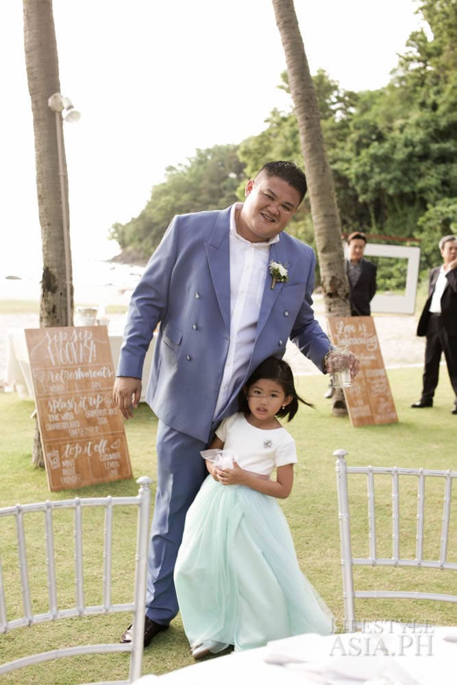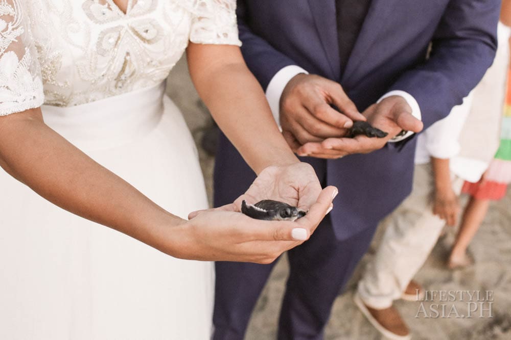 The wedding was at St. Catherine of Alexandria, followed by a reception at the Montemar Beach Club in Bagaac, Bataan. On their wedding day, a tent was set up on the beach. “The weather app said there would be light drizzles,” says Finina, “but we took our chances anyway.” The reception started with cocktails, then the release of baby pawikans out to sea. Then it rained.