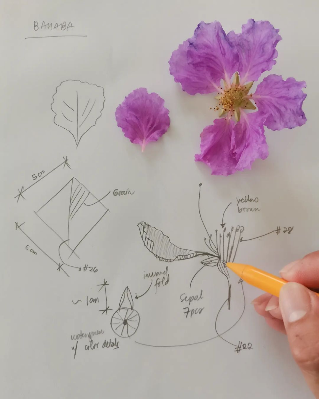 Research includes taking note of the measurements for every flower part, from petals to stigmata. Next, Rosales sketches these parts, creating an initial template for his paper bloom. He then groups certain parts together to maintain an overall appearance that’s cohesive and true to life.