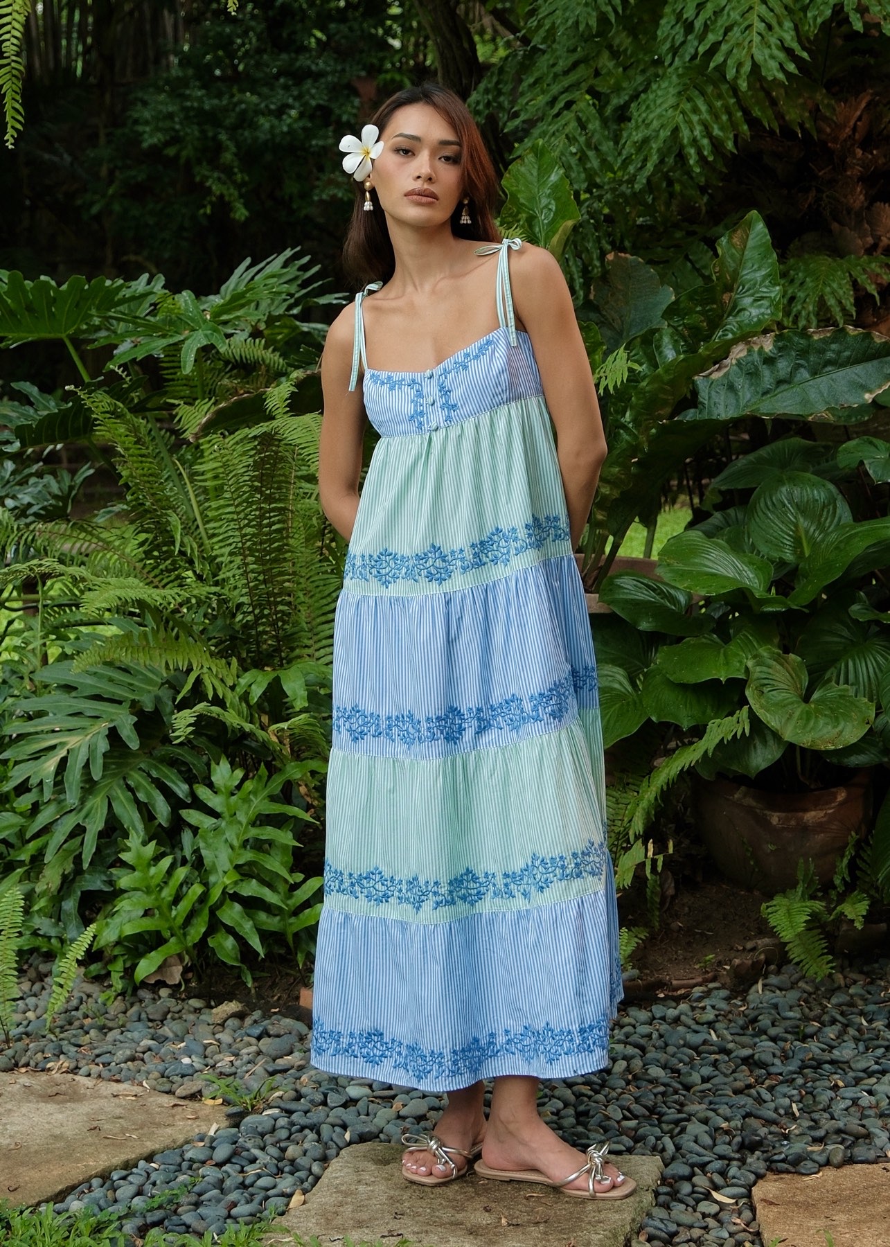 A glance at the collection reveals pieces that are versatile enough to be worn for casual strolls on a sunny day, as well as for starry night beach cocktails and evening garden parties. “The emphasis we place on Filipino embroidery and artisanship lends a unique and special spirit that allows each Amarie piece the ability to transcend occasions,” she says. The collection’s flexibility encourages each customer to wear and accessorize each of her designs uniquely, depending on the occasion and her own personal style.