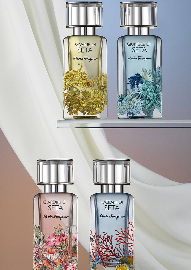 Inspired by fashion house’s silk creations, this collection is made up of four eau de parfums: floral fruity Giardini Di Seta, floral green Giungle Di Seta, sensual citrus Savane Di Seta, and floral aqueous Oceani Di Seta. They are designed to be worn alone or layered with one or more scents from the collection for a bespoke experience.