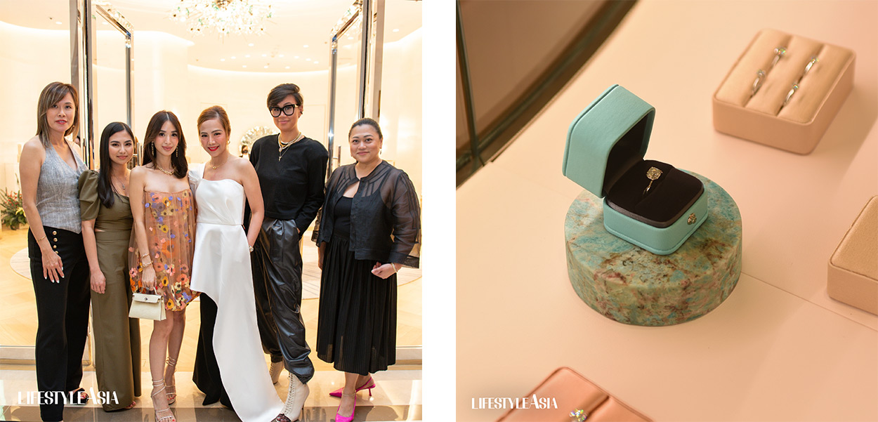From left to right: Marianne Liow, Regional Director, Tiffany & Co.; Rin Bucoy, Lease Manager, Solaire Resort & Casino; Heart Evangelista; Genevieve Jimenez-Yalung, Country Manager, Tiffany & Co.; Andee Aguirre-Jugueta, Vice-President of Retail, Solaire Resort & Casino; and Candy Dizon, Editor-in-Chief, LifestyleAsia (left); Tiffany engagement ring in a classic blue box up close (right)