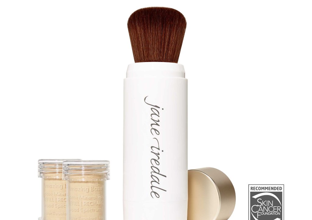 The counterpart refillable brush, the Amazing Base, applies a mineral foundation with broad-spectrum sun protection. This is available in five shades: warm silk, natural, bisque, golden glow, and warm sienna.