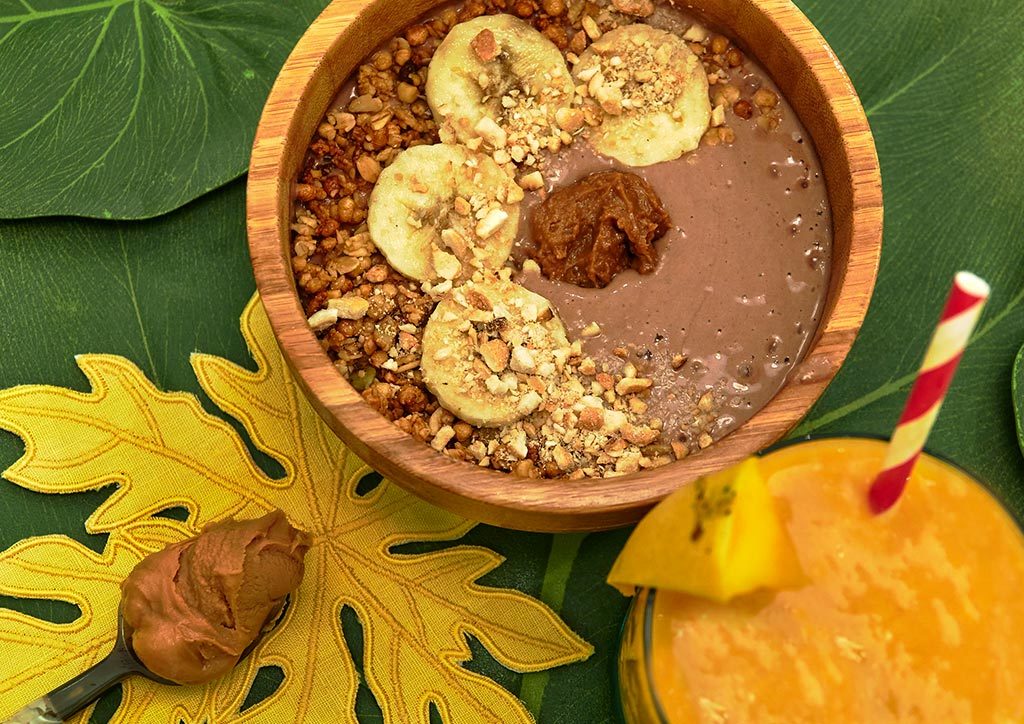 The Peanut Butter Bowl with banana, peanut butter, cacao powder, soy milk, granola, cacao nibs, cashew nuts and cookie butter, P220