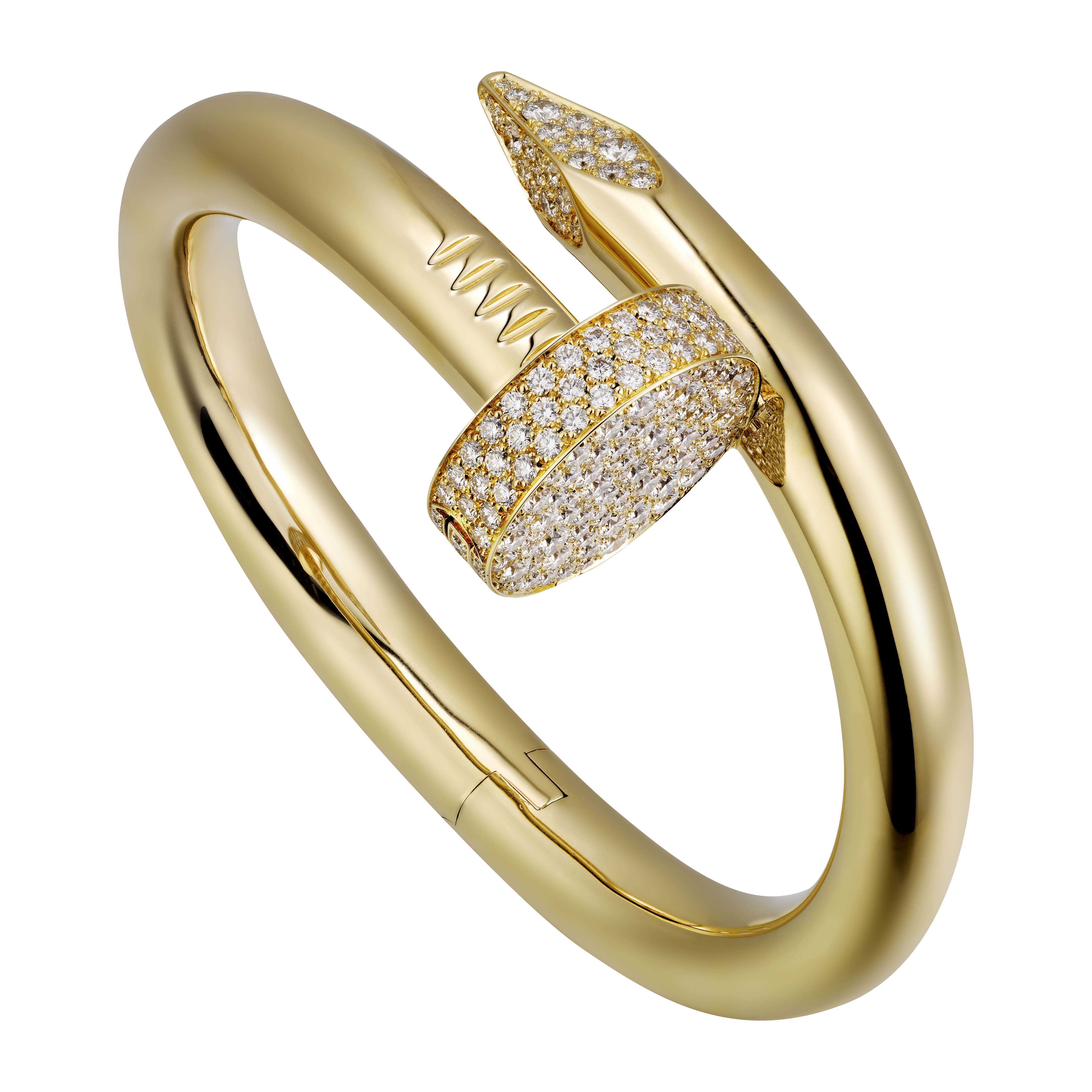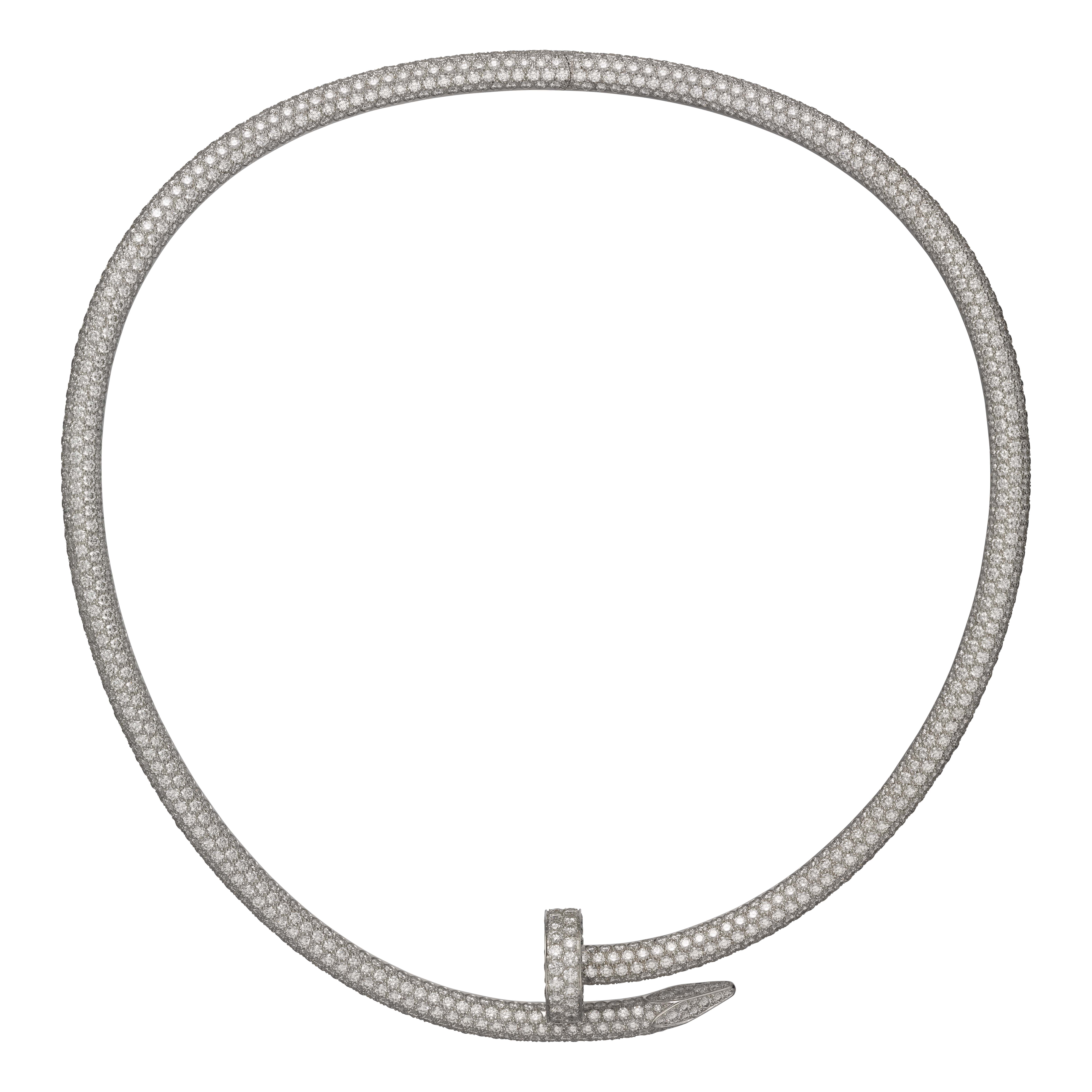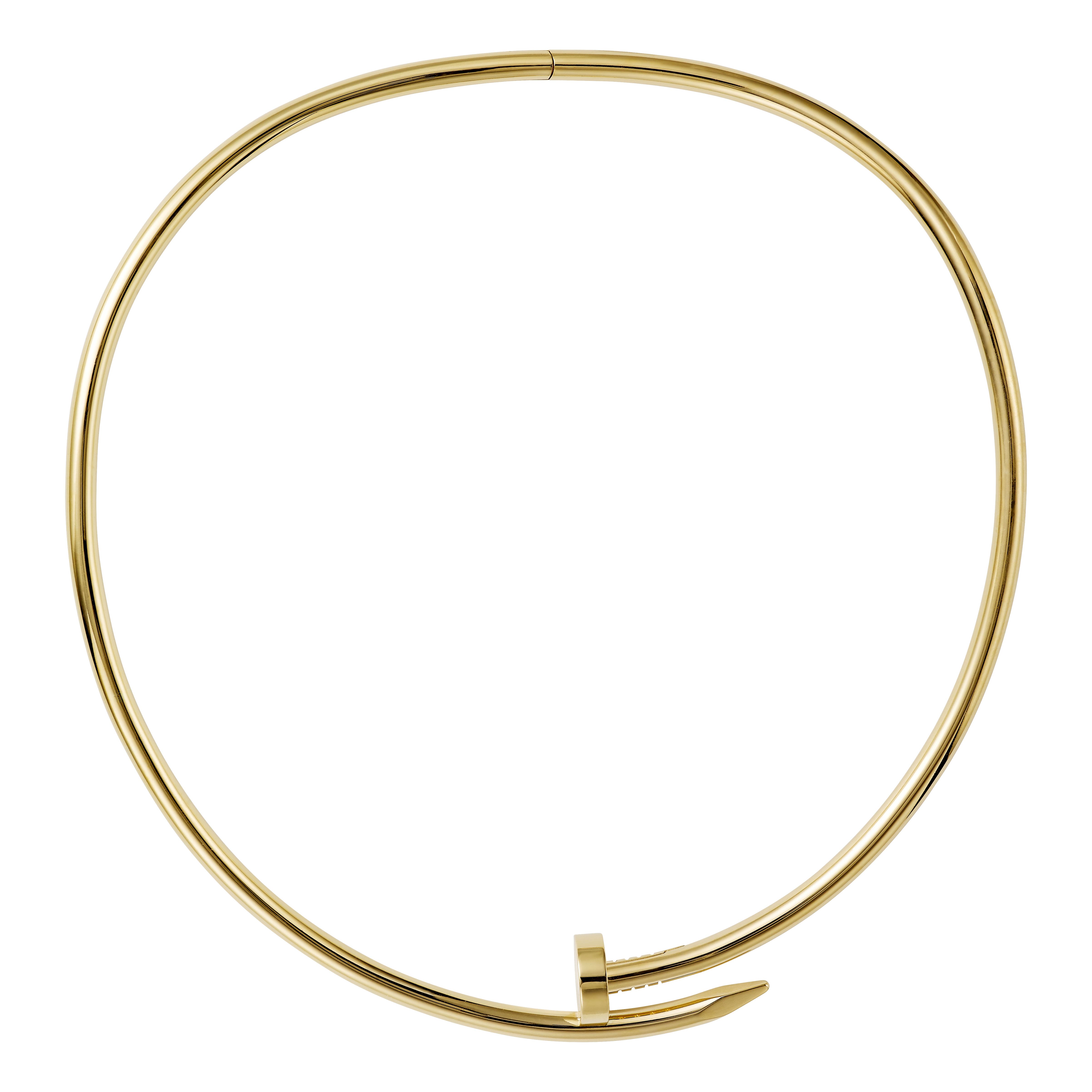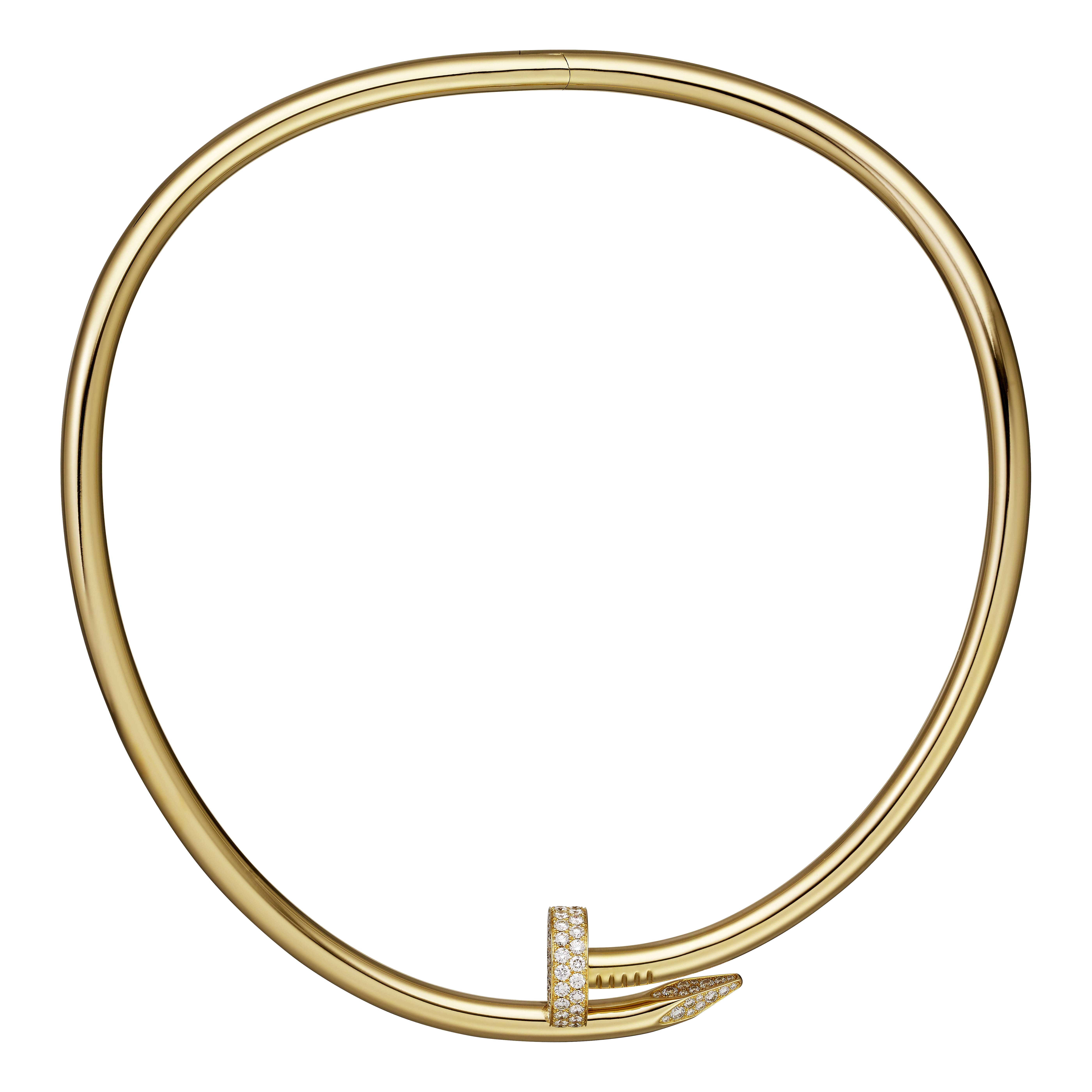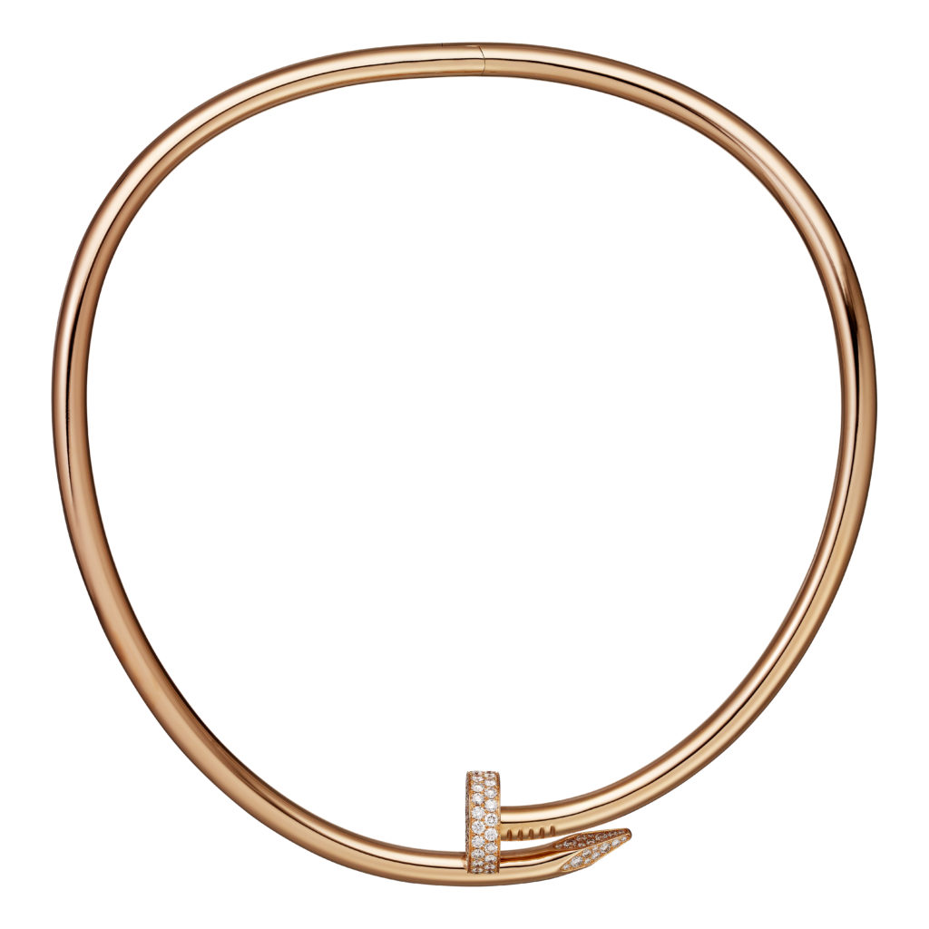Created by Aldo Cipullo for Cartier New York to reflect the anti-conformist sentiments of the 1970s, the hardware bracelet found fans in fashion forward rebels looking for easygoing pieces of jewelry. Today, Cartier has re-invented the iconic piece, even hammering it into a necklace. The Juste Un Clou Torque finishes the collection with an array of oversized bracelets and a necklace available in yellow gold, pink gold, white gold, or paved in diamonds.