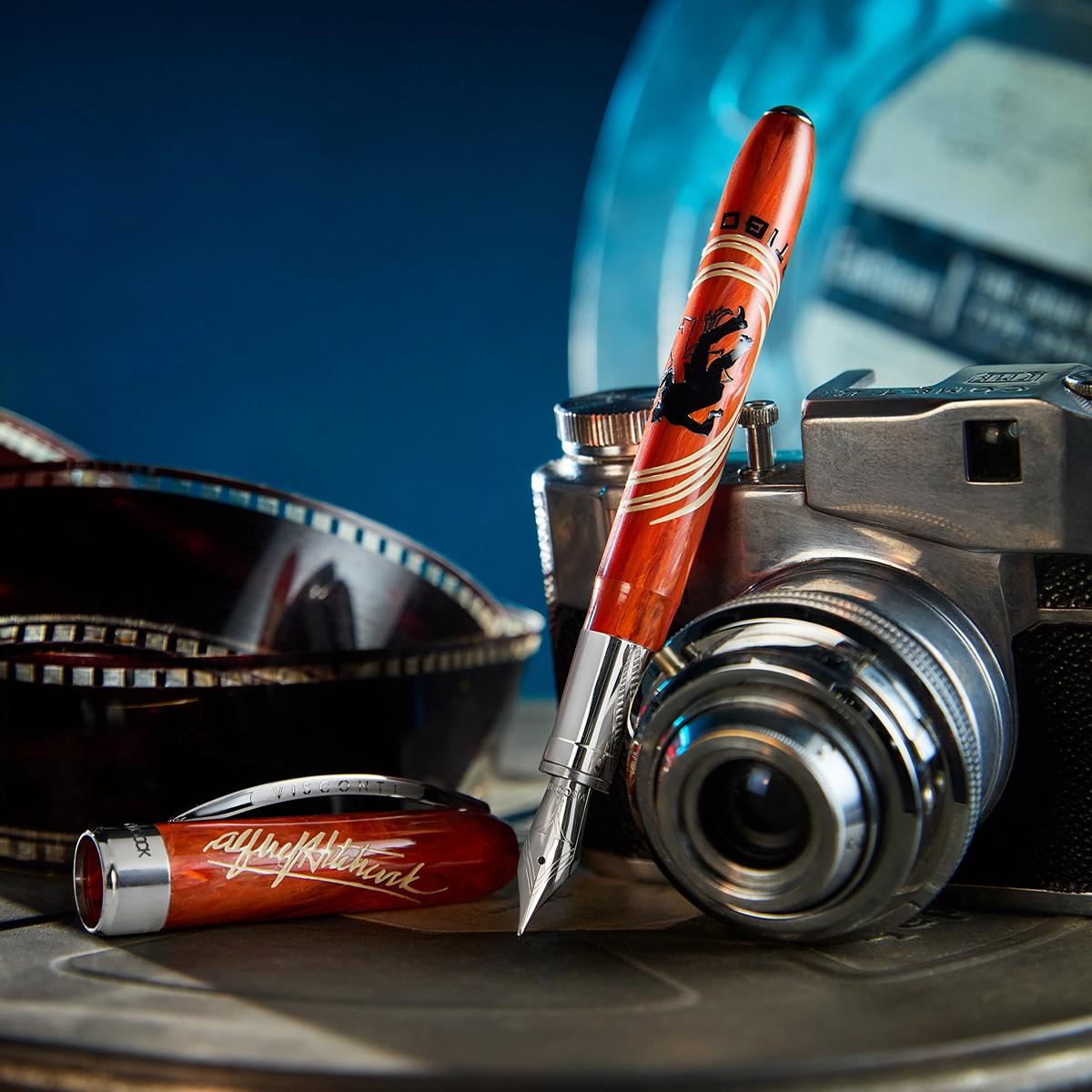 The pen features a steel nib (it’s Visconti, so expect a butter-smooth writing experience); a classic cartridge or converter filling system; a cap with an engraved and enameled reproduction of his signature; and a central ring that showcases both the Visconti logo and Hitchcock’s profile.