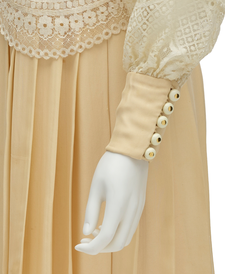 Valentino designed the two-piece outfit for his Spring/Summer 1968 haute couture collection, where the lace bodice floated over a dress with a pleated skirt. The sophisticated Valentino ivory lace ensemble became an immediate worldwide sensation. Suddenly, all brides in the swinging 69s wanted a wedding dress with its knee-length pleated skirt, mock turtleneck, and long bishop sleeves. The dress heading to auction signifies a pivotal moment in fashion, marking Jacqueline Kennedy’s transition from Queen of Camelot into “Jackie O” (short for Jacqueline Onassis).