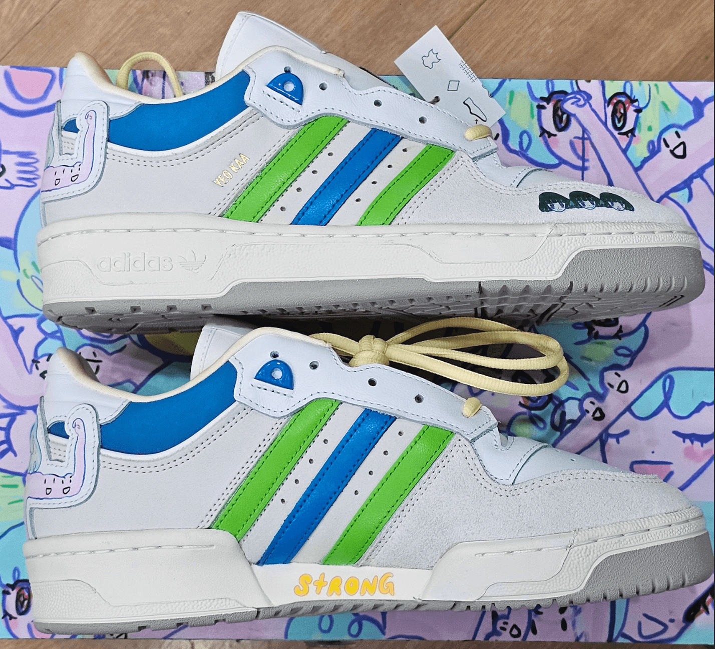 Furthermore, the Rivalry 86 Low has a clean leather upper sporting the iconic 3-Stripes, but the “Strong Girl” colorway also features several unique design elements. The bright blue and solar green stripes contrast with the off-white footwear. Which Yeo Kaa associates with her new state of calmness and freshness. Also, the graphic print of the word “Strong” in Yeo Kaa’s own typeface can be found in the midsole. Yeo Kaa’s signature character, as seen in most of her artworks, appears on the shoe with the largest and most noticeable is stitched to the heel. The character has its arms flexed to depict personal strength. The character is also seen in the mudguard where three expressions of the character’s face are shown: surprise, happiness, and determination — emotions that reflect a journey to finding the motivation to keep fighting.