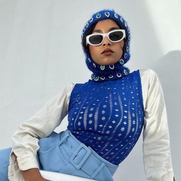 The London-based shopping site considers Kim Kardashian’s full-face and body-covering ensemble from last September’s MET Gala as the trend’s original culprit. At the same time, TikTok influencer and trend forecaster Mandy Lee calls the trend “approachable” given you can knit one yourself. She adds that its aesthetic can go from “apocalyptic” to “glamorous,” depending on its style.