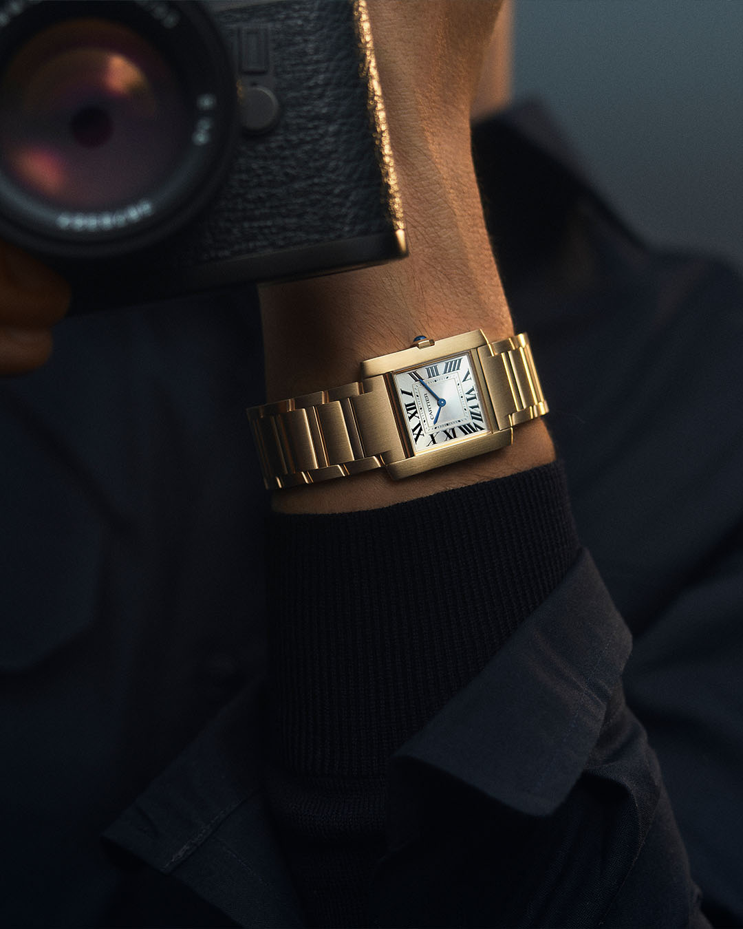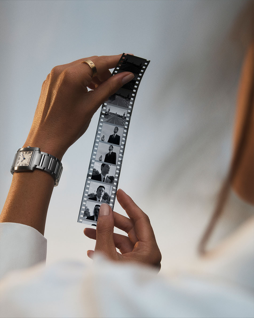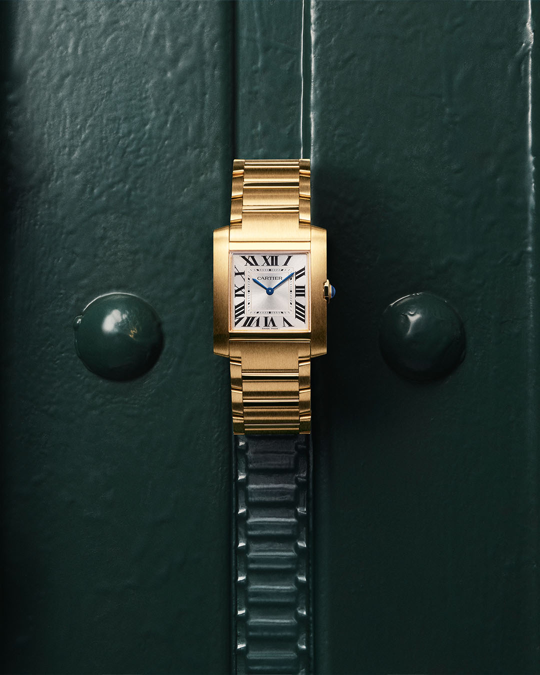 The classic steel bracelet of the Tank Française, front and center in its stunning relaunch campaign.