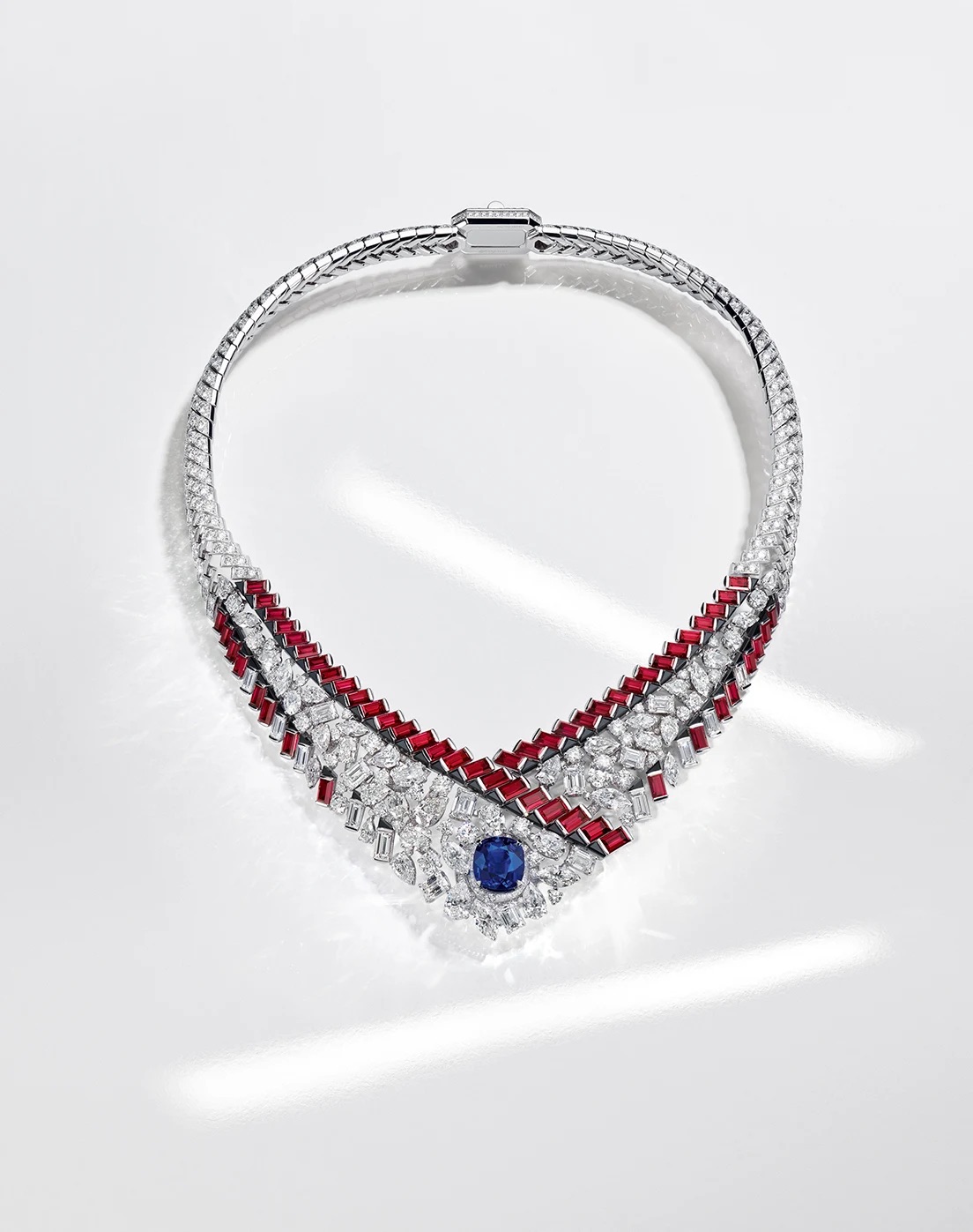 The Haute Joiallerie Sport Collection pays homage to the Chanel woman who is always effortlessly chic but always on the move. The key themes in this collection are rhythm and speed. These are evoked by the chevron pattern and the gradation of 24.35 carats of baguette-cut rubies in clean, straightforward lines. A necklace or a ring from this line is perfect for a woman of a certain stature—high respectable stature that is.