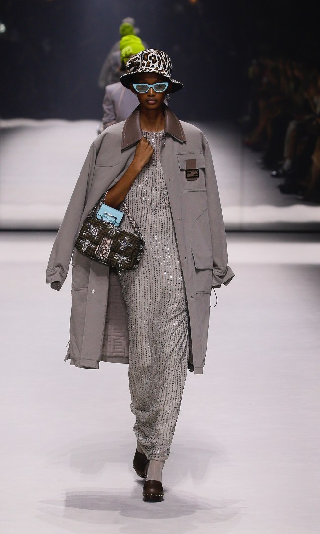 For Fendi, the essential utility of the bag becomes a multi-pocketed motif, migrating throughout the collection. The unmistakable Baguette dimensions made mini and micro pockets, appearing on parkas to gaiters, roving all over the body, covering gloves, hats, skirts, sweaters and, of course, the bag itself in one of its new iterations. In contrast and cohesion, a sense of hyper-luxe and glossy glamour pervades the collection – the Baguette is not entirely utilitarian after all. Those gaiters are made from silk satin, that parka shaved mink or glossy leather; a stratification of sequins and biased cut silks are often layered beneath, adding a shimmer of art deco allure.