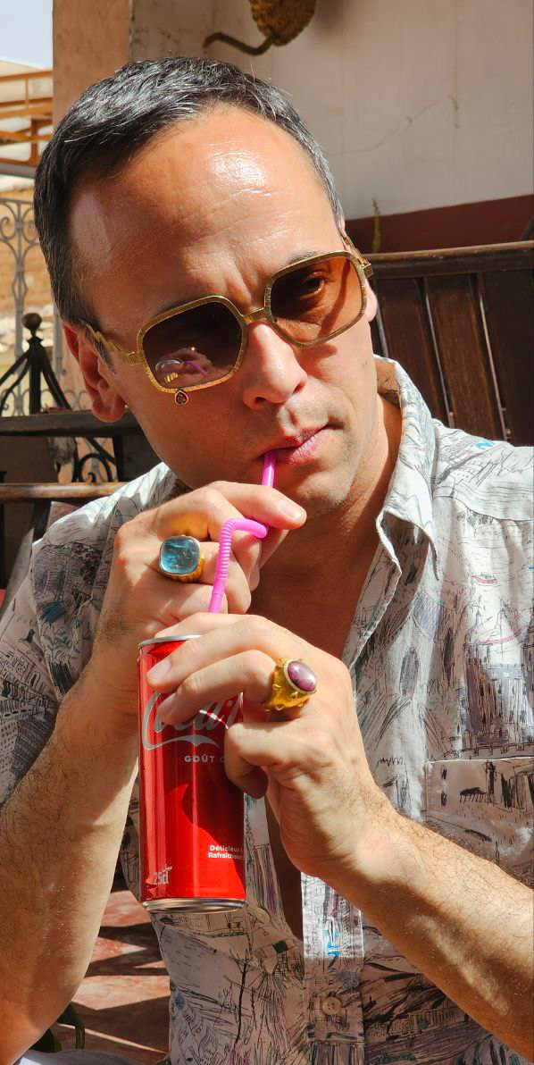 John-Paul Francis de Lara Pietrus, the creative director and founder of Francis de Lara High Jewellery-Eyewear wears The Pentagons with Red Garnet Teardrop; Deep Sea Rings in 18-karat gold (Sugar Loaf Cabochon (top) and Organic Square Cabochon (bottom) giving a buried relic look) / Photo by Oxana Korsun, taken in Morocco