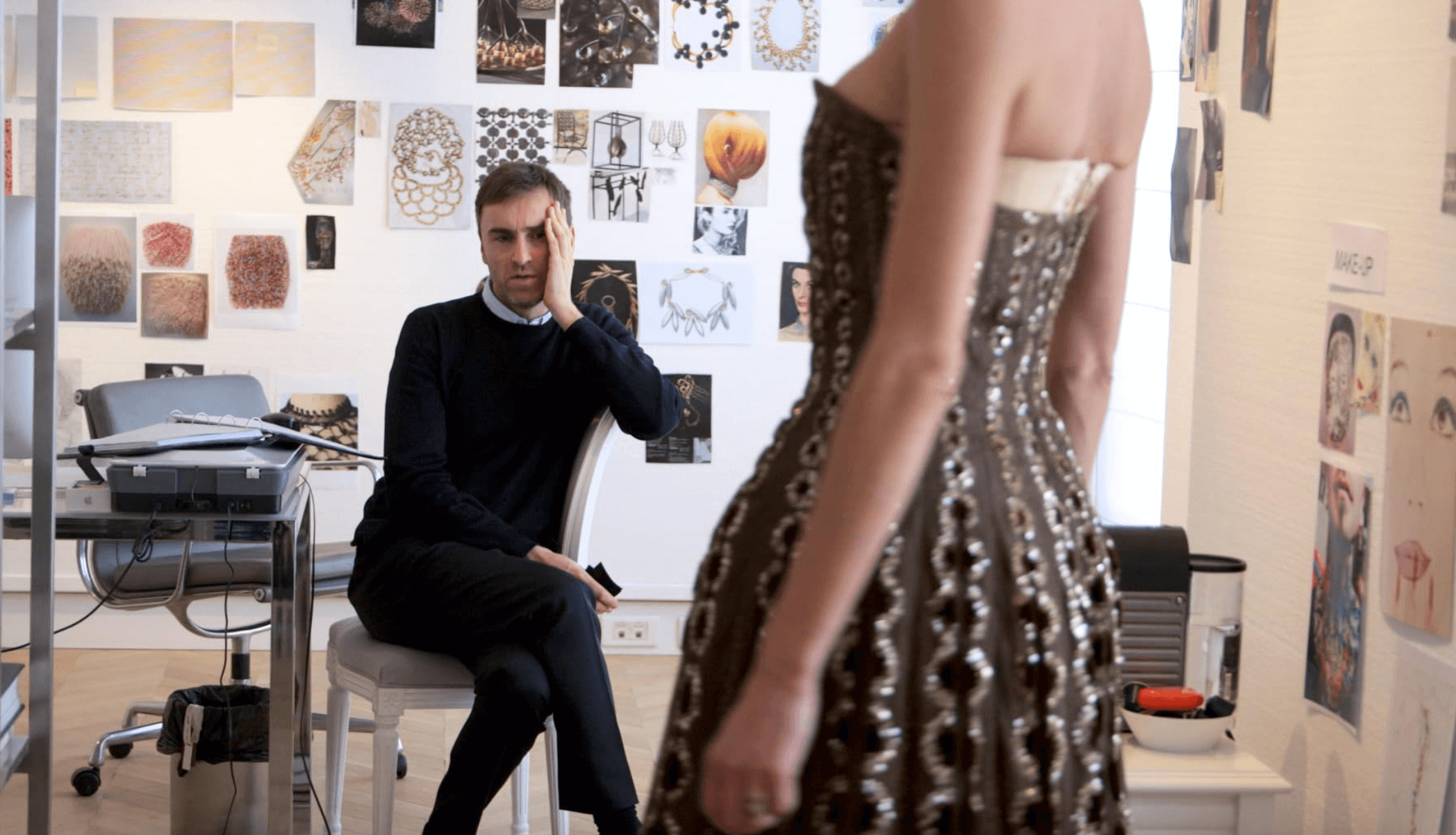 It captures Simons’ journey from his start at the historic fashion house to the detailed craftsmanship of each piece made in the workshop.