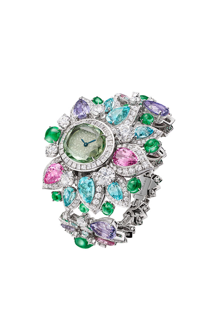More than 1,500 stones are matched in the Giardino Dell’Eden Piccolissimo watch, showing a lively combination of butterfly and flower designs inspired by Bulgari’s pieces dating back to the Sixties.