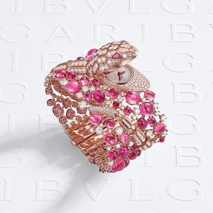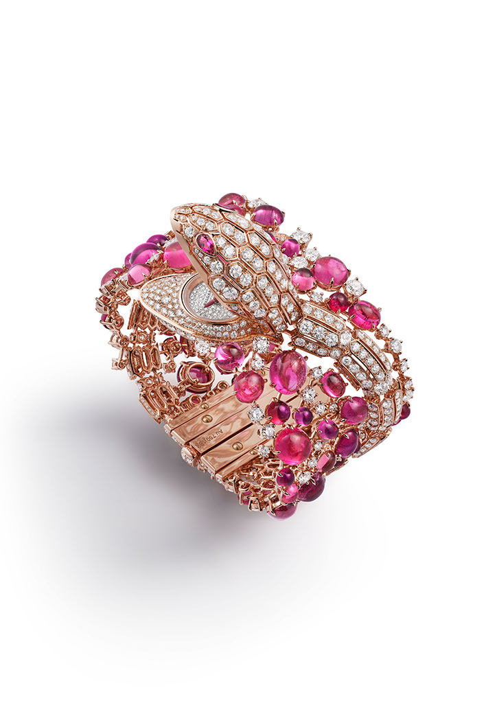 This new watch celebrates Bulgari’s trademark snake, with its dial hidden underneath the animals’ head. It combines rose gold, round brilliant-cut diamonds and cabochon rubellites. The stones seem floating in the air thanks to the use of the fil couteau technique, that enables to keep the elements together through thin gold threads.