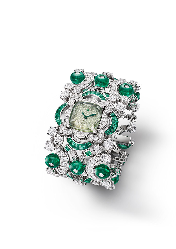The timepiece required 900 hours to be crafted by five different artisans. It has the white gold dial visible through a faceted mint green tourmaline, a see-through stone that makes it possible to read the time in transparency.