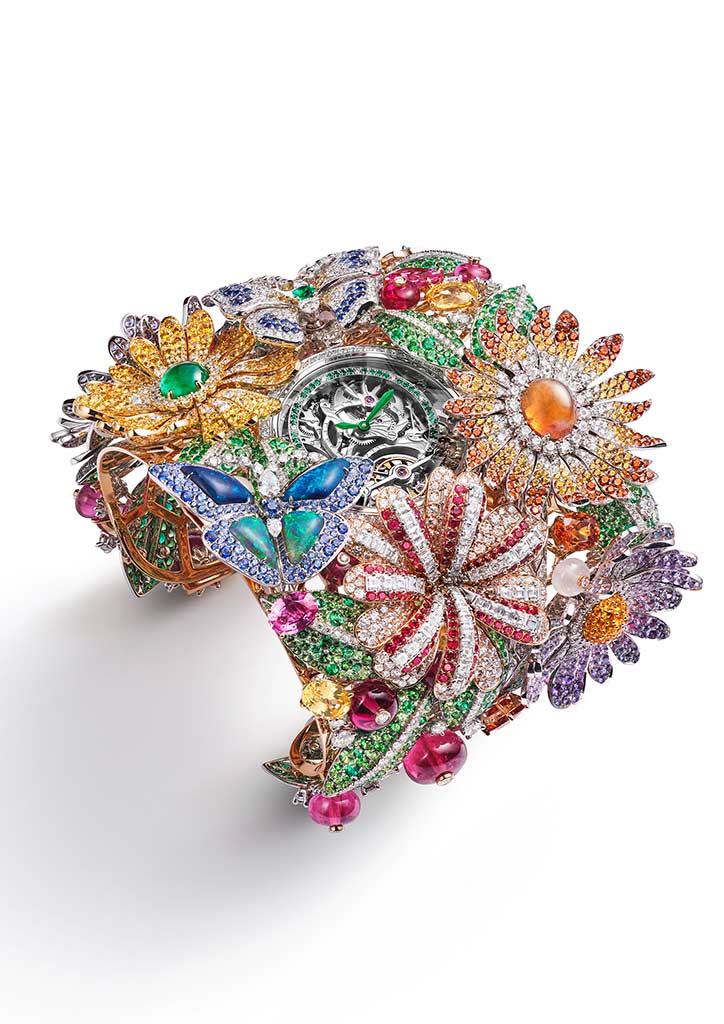 The watch is enriched with 6,500 stones with a total of 223 carats, spanning from cabochon Paraiba, emerald and garnet to pink tourmalines, opals, rubies, multicolor sapphires and diamonds.