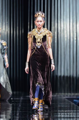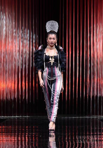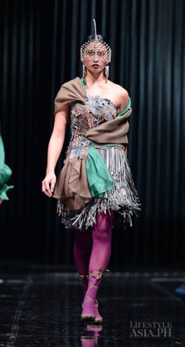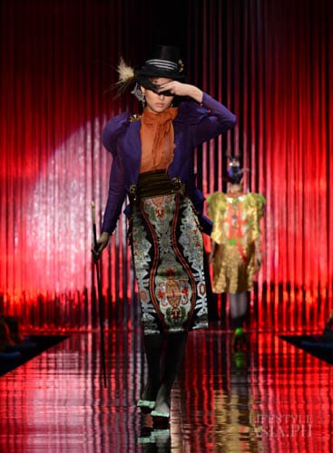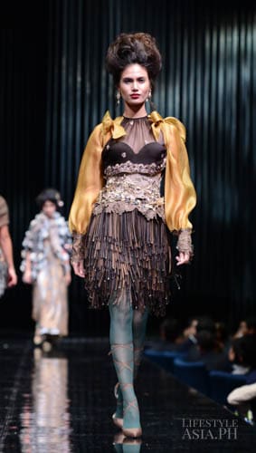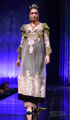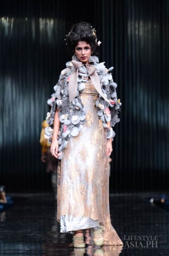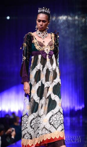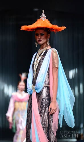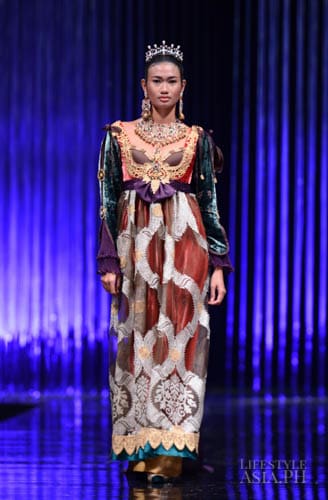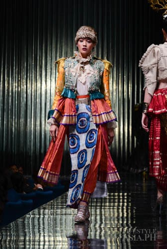 Chito’s interests in travel, history, race, and religious ornamentation all surfaced in his collection. “It is based on Philippine history. For example, the colonial components are based on the Galleon Trade. That’s why there’s a melange of different fabrics—from India, from China. This is because we were trading with these countries then. That’s why I referenced Spanish influences on our culture. But I tweaked it so you don’t only see Maria Clara sleeves.”
