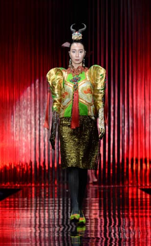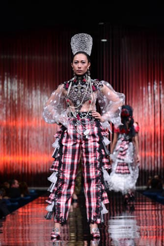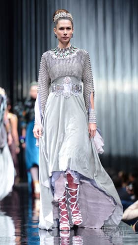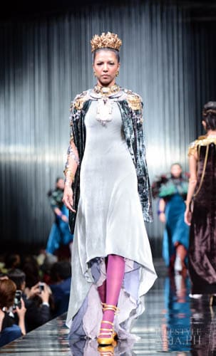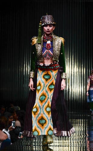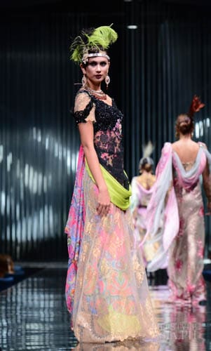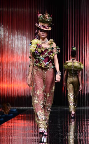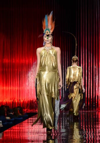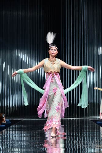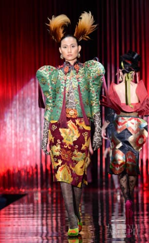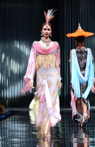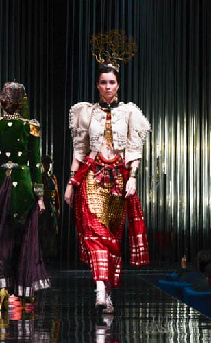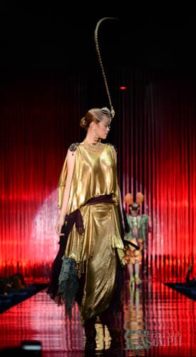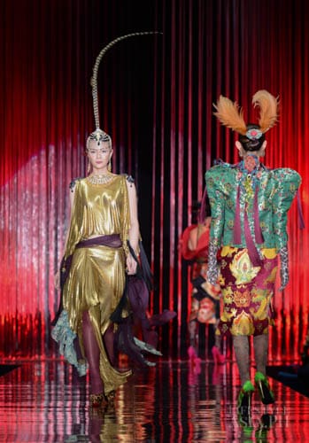 And so it was fashion phantasmagoria for all the attendees that night, their eyes transfixed on the dizzying array of sartorial detail that spilled onto the silver mirrored stage. There were what seemed like Himalayan princess in ethnic chapeaus and pointed shoes. There were Spanish lasses in modernized mantillas and lace fans. A bevy of Belle Epoque gals in flapper dresses mixed with lady maharajas in feathered headdresses.