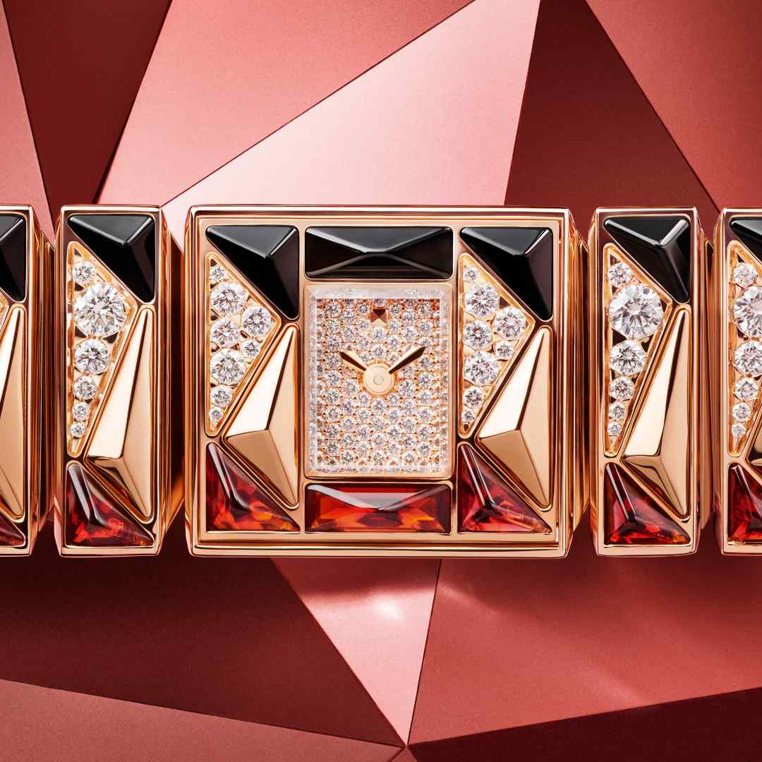 The Cartier Libre jewelry watch is entirely reversible. Consequently, it doubles as a watch on the front and as a bracelet on the back. The geometric approach to the jewelry motif uses a new triangular setting developed by Cartier, allowing the diamonds to be directly integrated into the case without the need for the traditional grain setting.