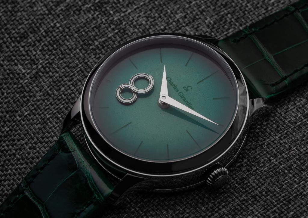 The Charles Girardier Magic 8 stands out with its dial to literally reflect its name. The design choice is a kinetic composition that creates an “eternal motion” on the magic 8 dial. The case is made of titanium and a silver plate serves as base, while the dial comes in cobalt blue and emerald green.